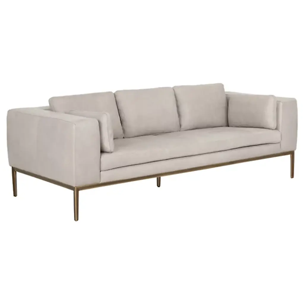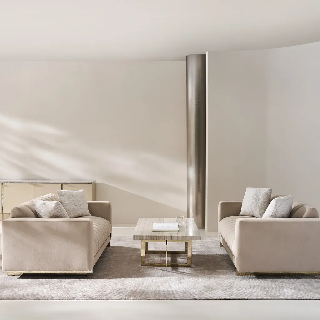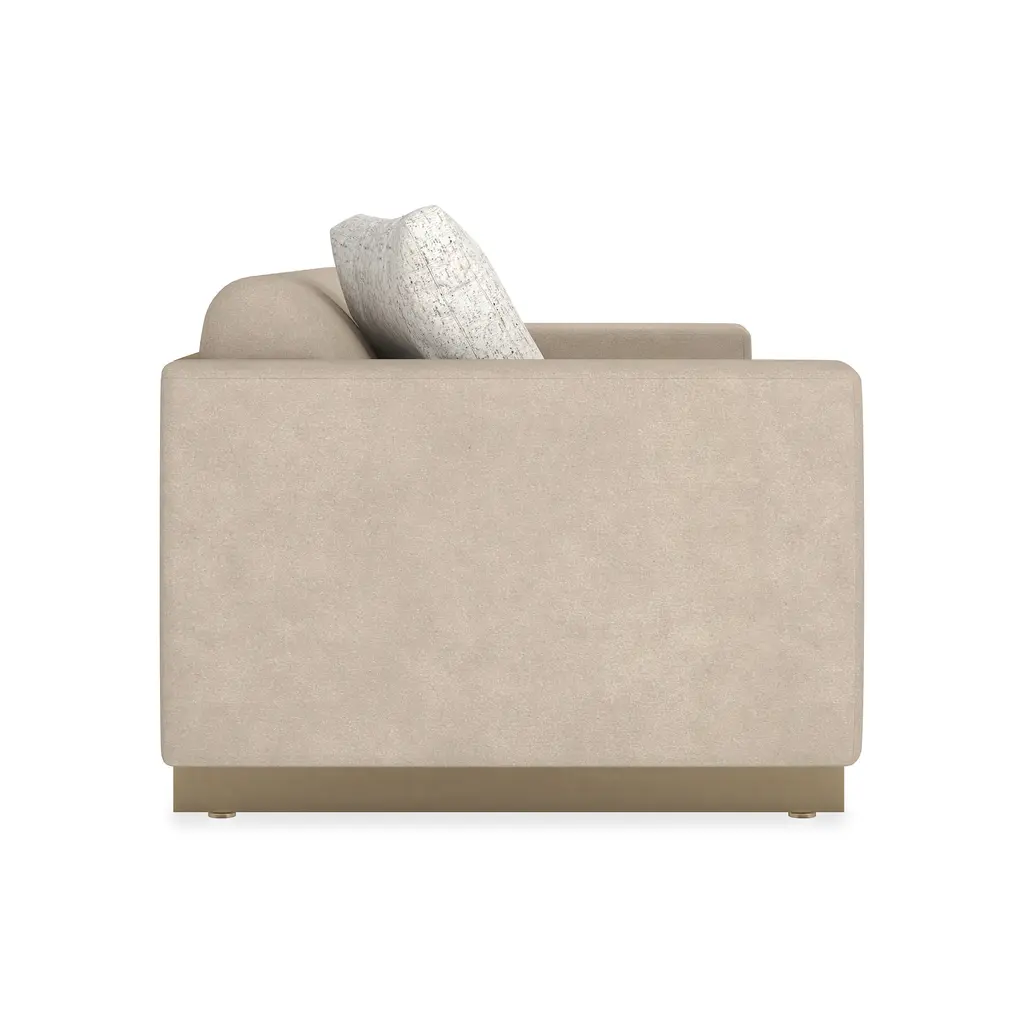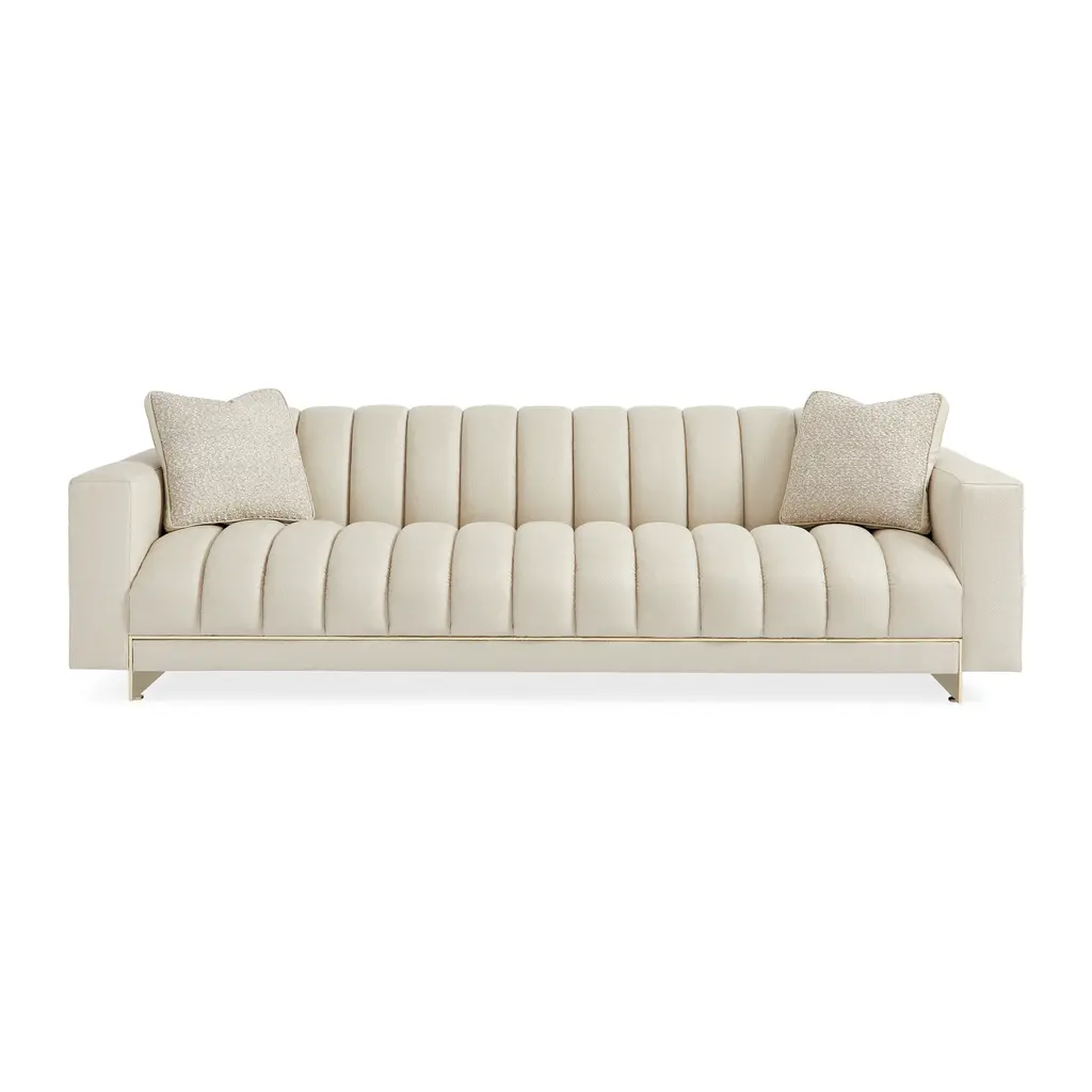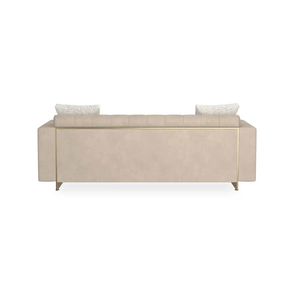 The Well-Balanced Sofa was inspired by Italian design and offers beautifully tailored channel tufting in a luxurious basketweave fabric in a shimmering Moonstone hue. This stylish vogue detailing and cosmopolitan silhouette makes this sofa the perfect focal point to build a spectacular room around in whichever chic city you're in across the globe. A tailored, thin gold detail is incorporated into the sofa frame. Its squared arms are the perfect height for resting or reading. Suspended off the ground by a continuous Majestic Gold framework, this sofa appears to be lighter than air. This sofa's sophisticated lines look beautiful when floating in an interior. Consider a pair of sofas in front of a fireplace or to enjoy a beautiful vista. It also pairs beautifully with the Well-Balanced Chair and Ottoman and our seriously stylish Svelte chairs. Features