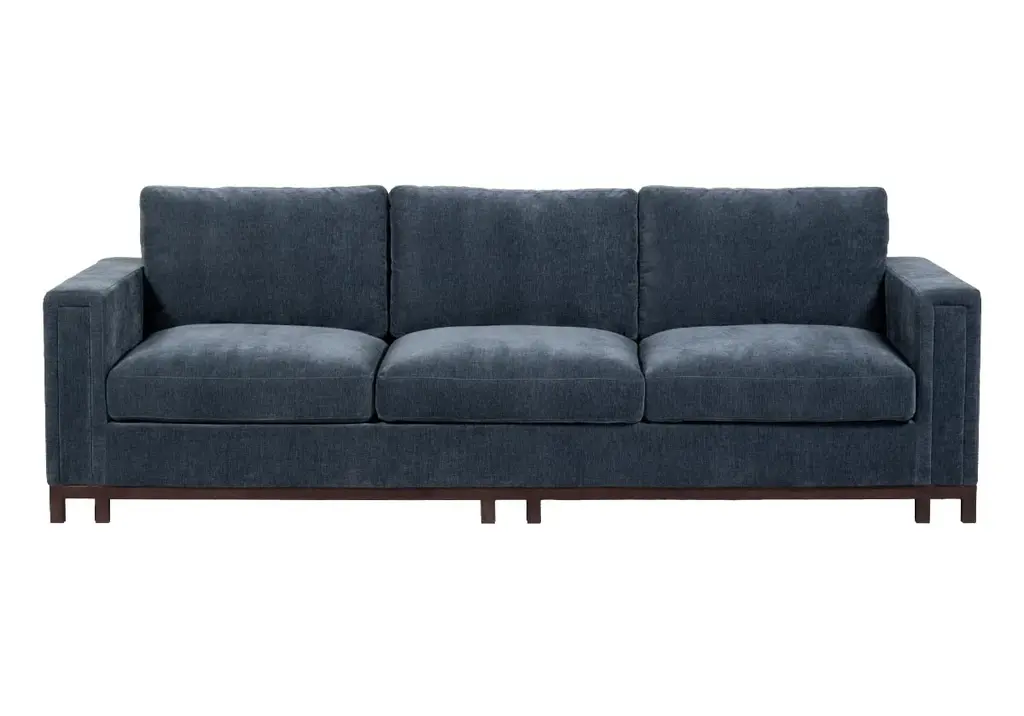 Generous and luxurious, the Theo Sofa is an incredible addition. Featuring an elongated form, deep seat, and three comfortable back cushions it effortlessly lends a handsome, elevated look to offices, living, and family rooms. Its channeled design is complemented by matching, punctuated walnut wood feet. A subtle woven sheen throughout its upholstery adds visual texture, creating a tasteful statement piece.