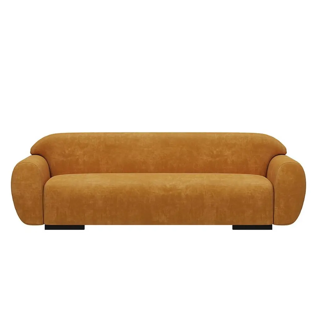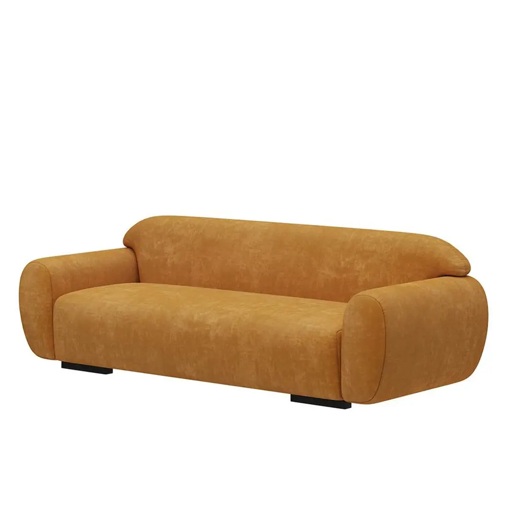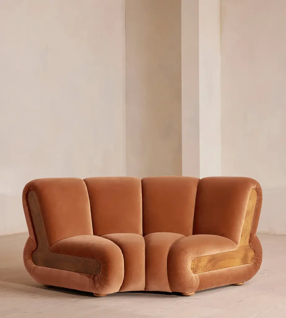 Sofa Theodor with solid wood structure, upholstered andcovered with cotton velvet fabric in faded orange finish.Feet in ashwood in satinated Wenge in matte varnish finish.Also available with other fabric and finishes on request.