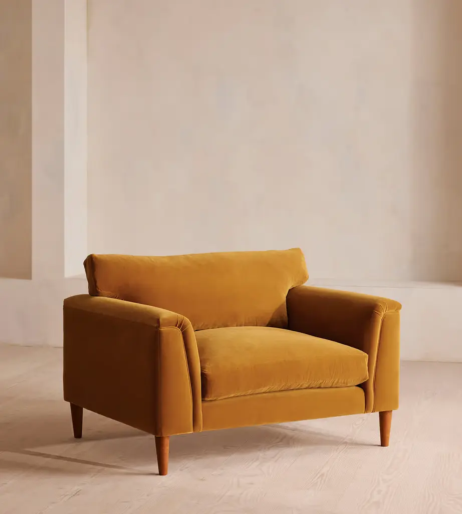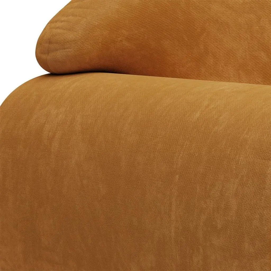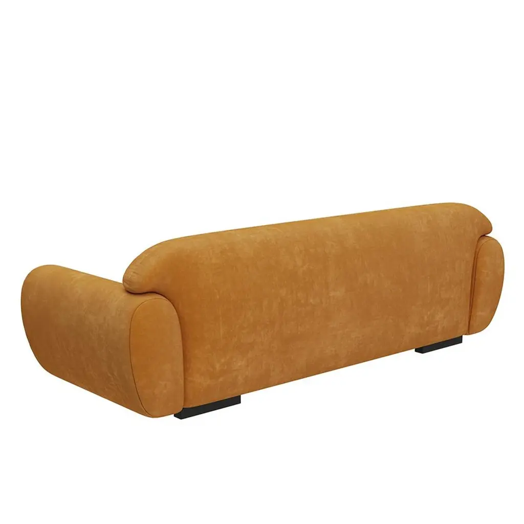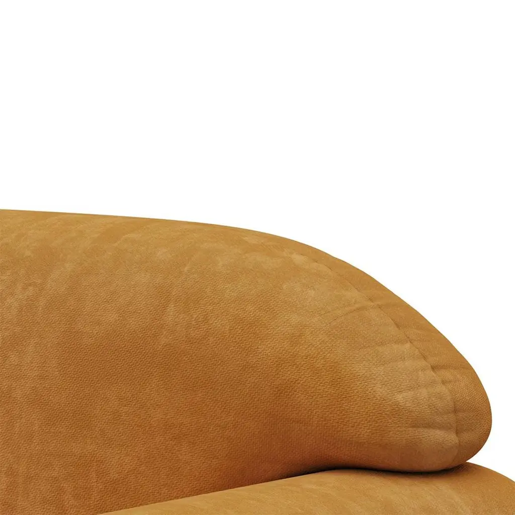 Sofa Theodor with solid wood structure, upholstered andcovered with cotton velvet fabric in faded orange finish.Feet in ashwood in satinated Wenge in matte varnish finish.Also available with other fabric and finishes on request.