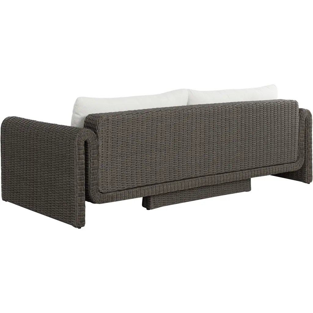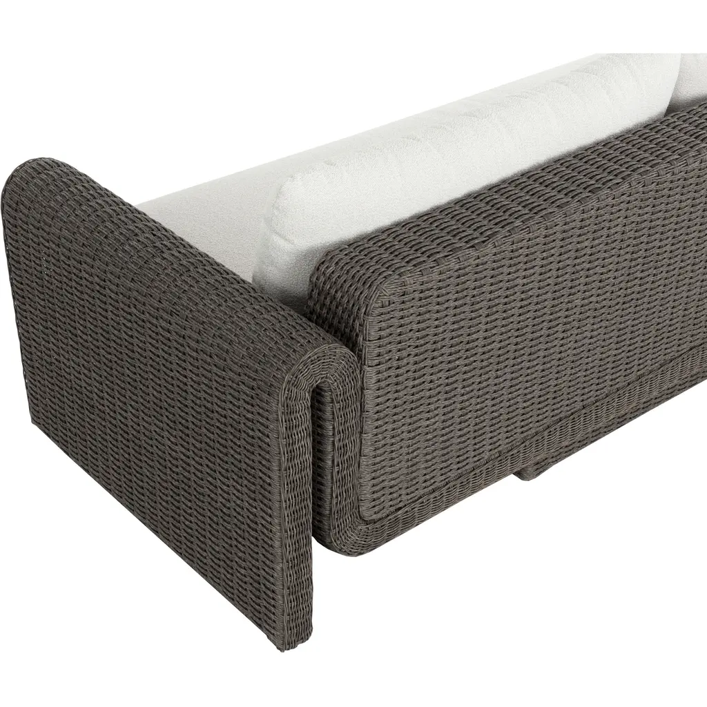 The curved proportions of the Tibi Sofa enhance the textural beauty of handwoven twisted wicker. The rolled arms connect seamlessly to nestle the comfortable cushioning upholstered in our louis cream outdoor boucle performance fabric.