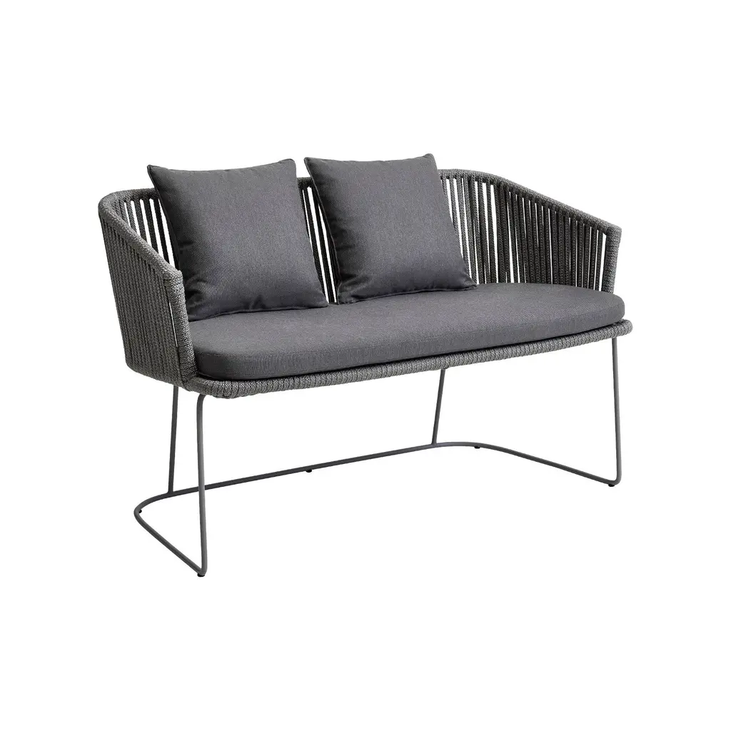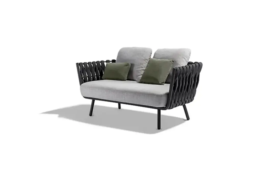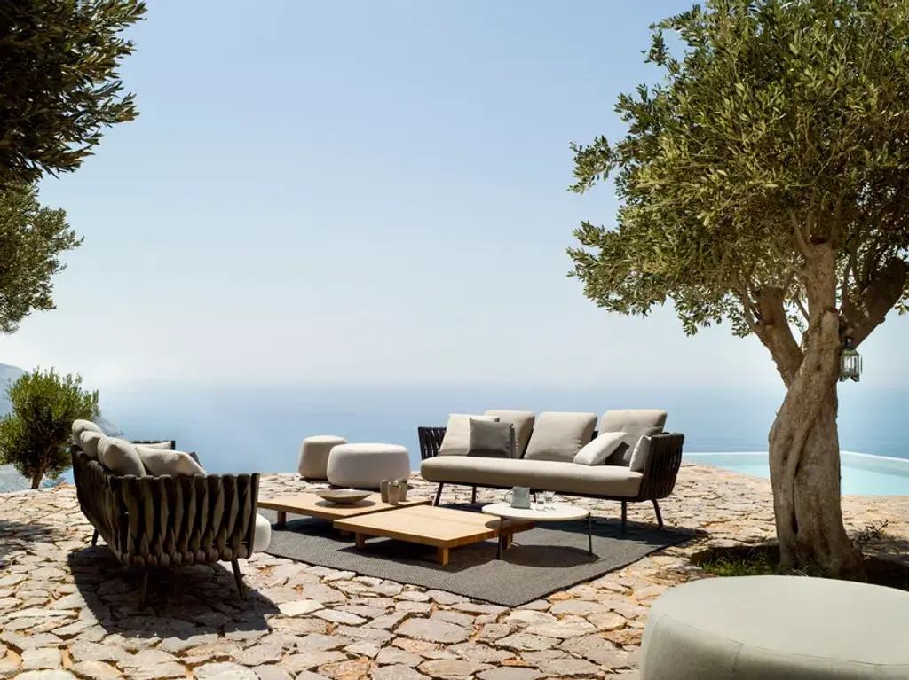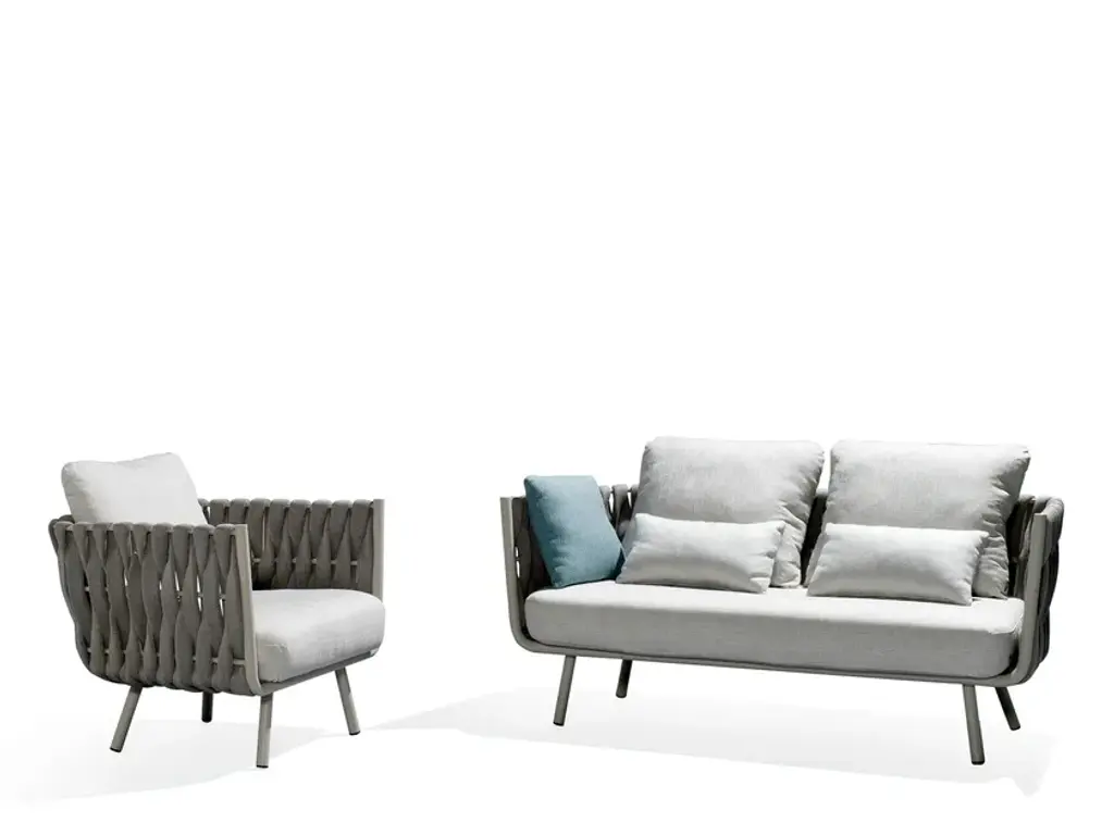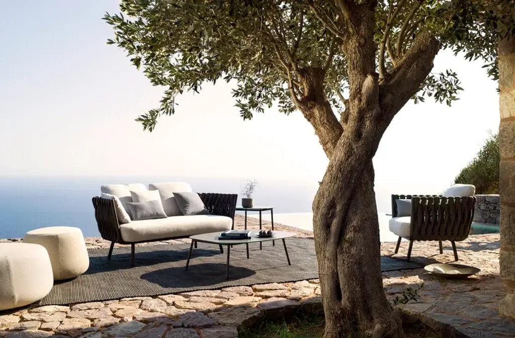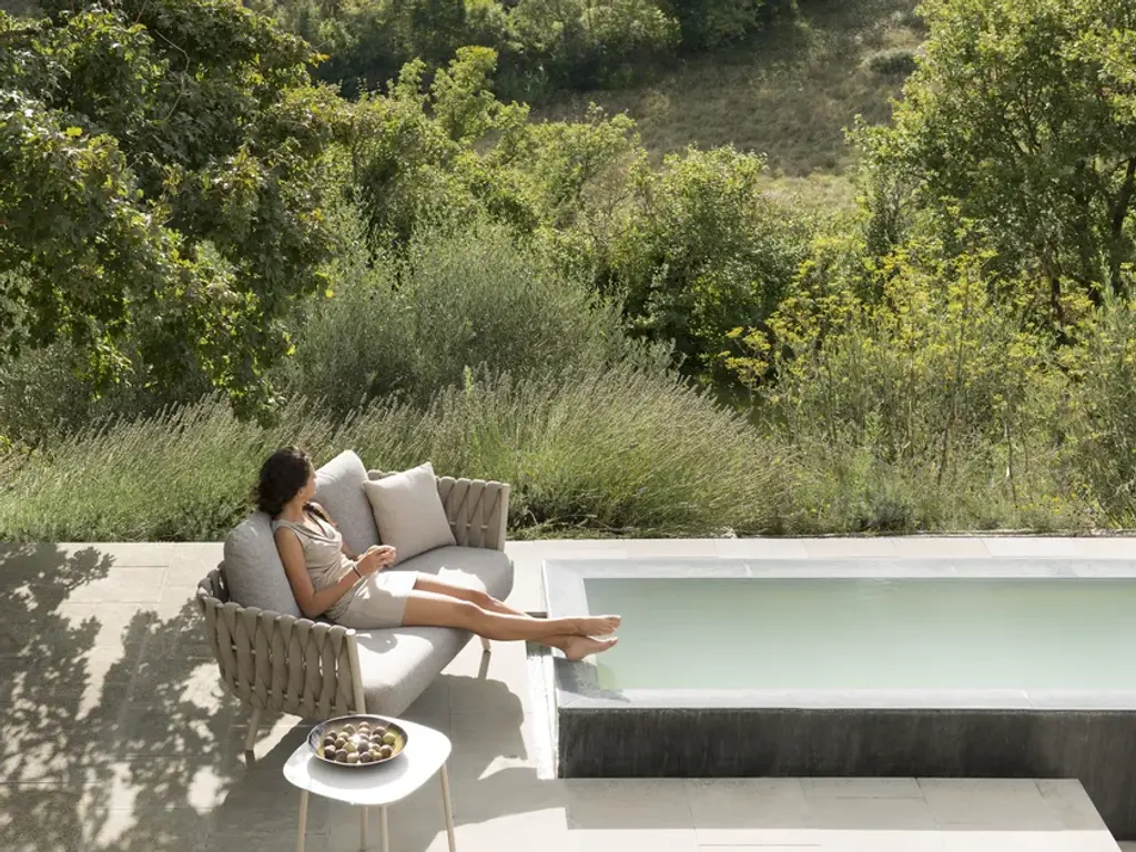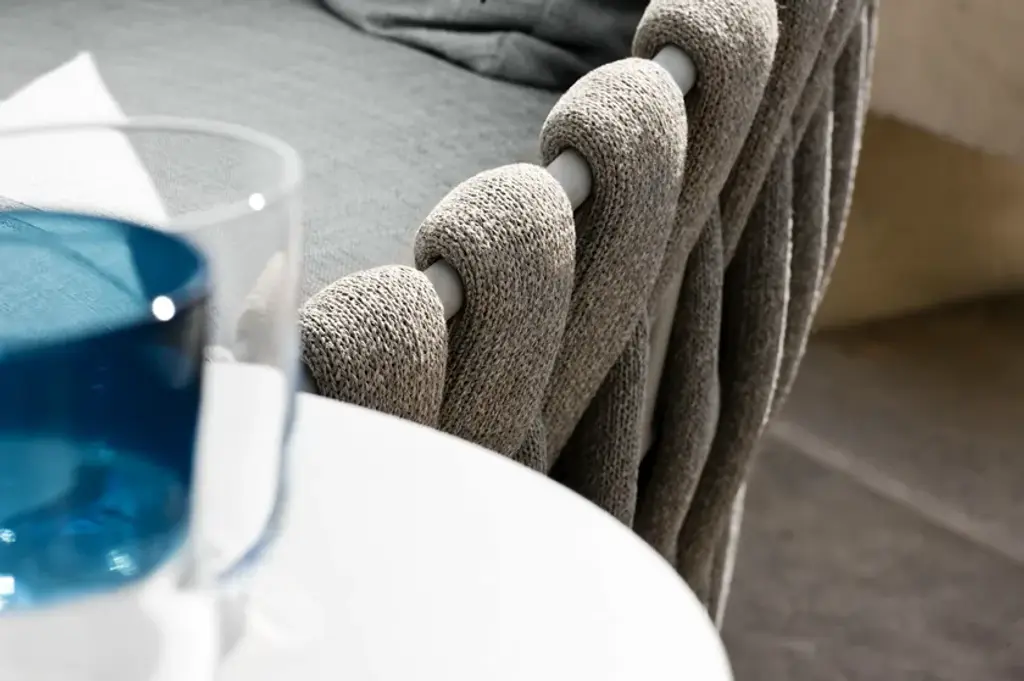 The Tosca outdoor collection is simultaneously warm and inviting, stylish and intriguing. It was the first time Tribù called upon a female designer to draw an outdoor furniture piece with a more feminine touch. Monica Armani succeeded in her challenge : rounded forms, tapered legs and an elegant seating shell in powdercoated stainless steel, upholstered with extra-wide braiding. The material for the braiding is genuinely innovative : foam mousse is encased in a seamless sheath of knitted textilene and polyolefine which makes the material weather-resistant, but also surprisingly soft to the touch. The seating comfort is especially pleasant, also thanks to the comfortable outdoor cushions.