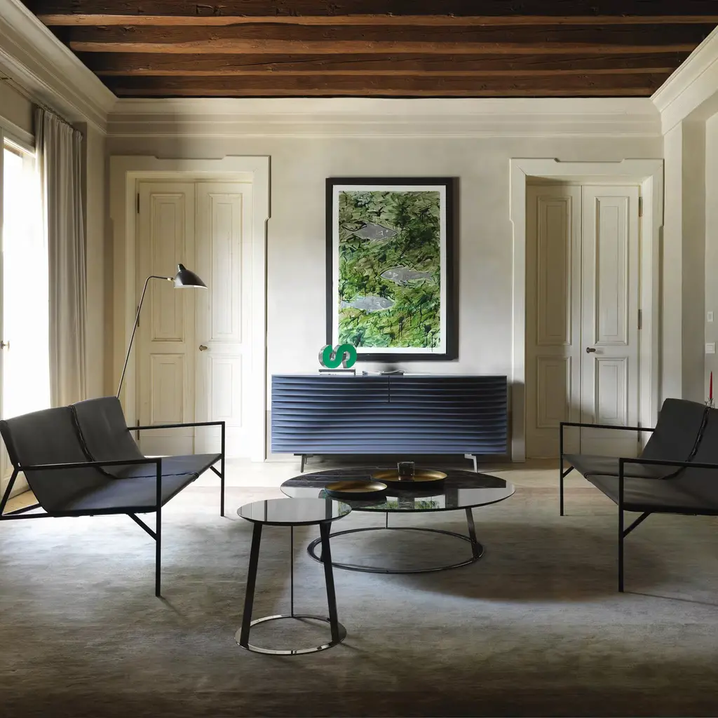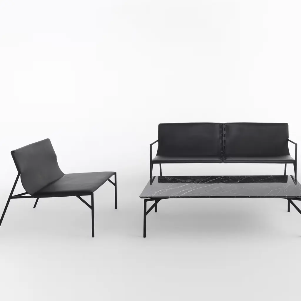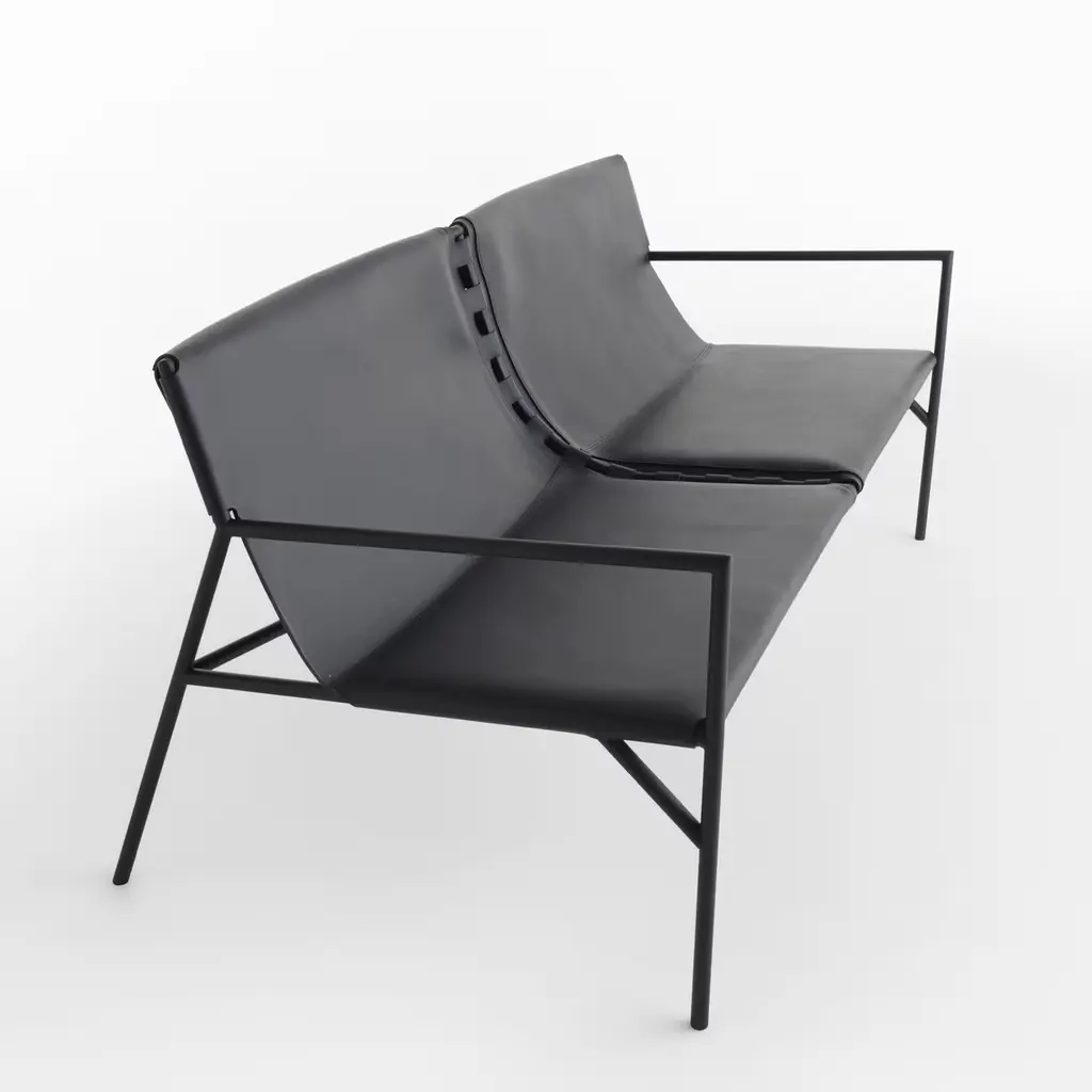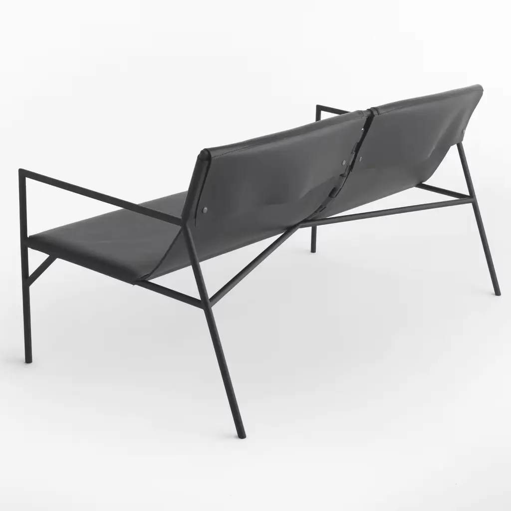 A slim and elegant sofa by Marc Thorpe, this piece combines a solid structure with refined materials for a sophisticated character. A simple and minimal design, it comprises a black metal structure with tubular legs and armrests, and a fine upholstery in black leather for the seat and backrest cushions.