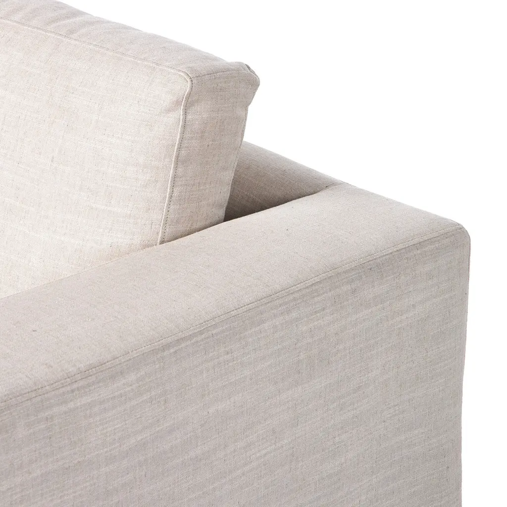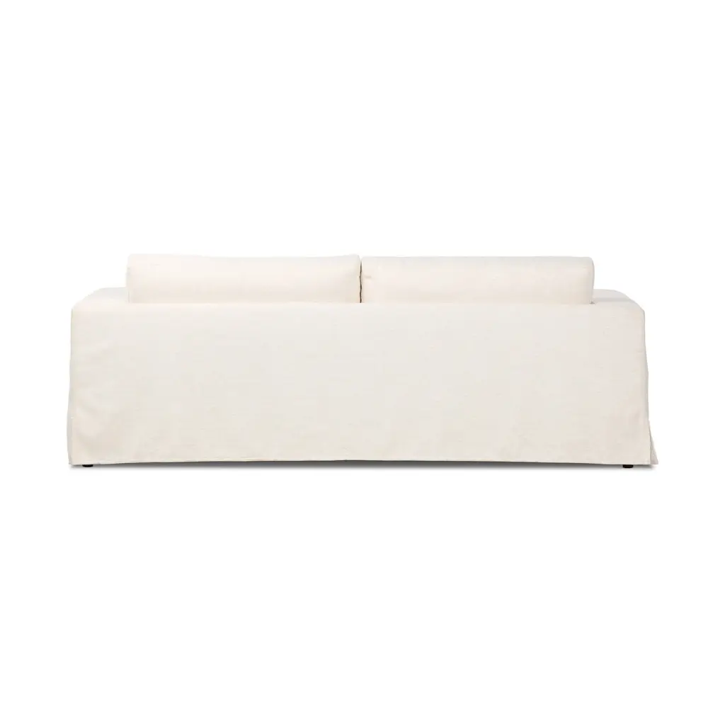 With its clean, laid-back look and modern silhouette, the Tovana Sofa from Four Hands is designed for ultimate relaxation. Crafted in Mexico, this spacious sofa features a unique draped form with deep pleats, wide arms, and an oversized bench-style seat cushion. Loose, feather-blend back cushions enhance the sink-in comfort, creating an inviting centerpiece for any living room. Upholstered in durable performance fabric, it offers a relaxed, slipcovered look with a perfectly tailored, non-removable finish. Highlights: