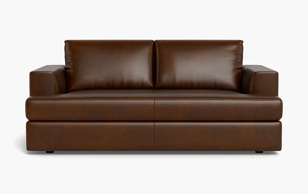 The clean and smooth aesthetic of this elegant sofa standing on four, egg-shaped ash feet (also in polished aluminum upon request) makes it a spot-on choice to complement commercial and residential decors. Natural latex and cotton are stuffed into the inner steel frame, combined with the general structure in directional European plywood. Evident, tone-on-tone stitching graces the vegetable-tanned brown leather to emphasize the design's sculpted look.