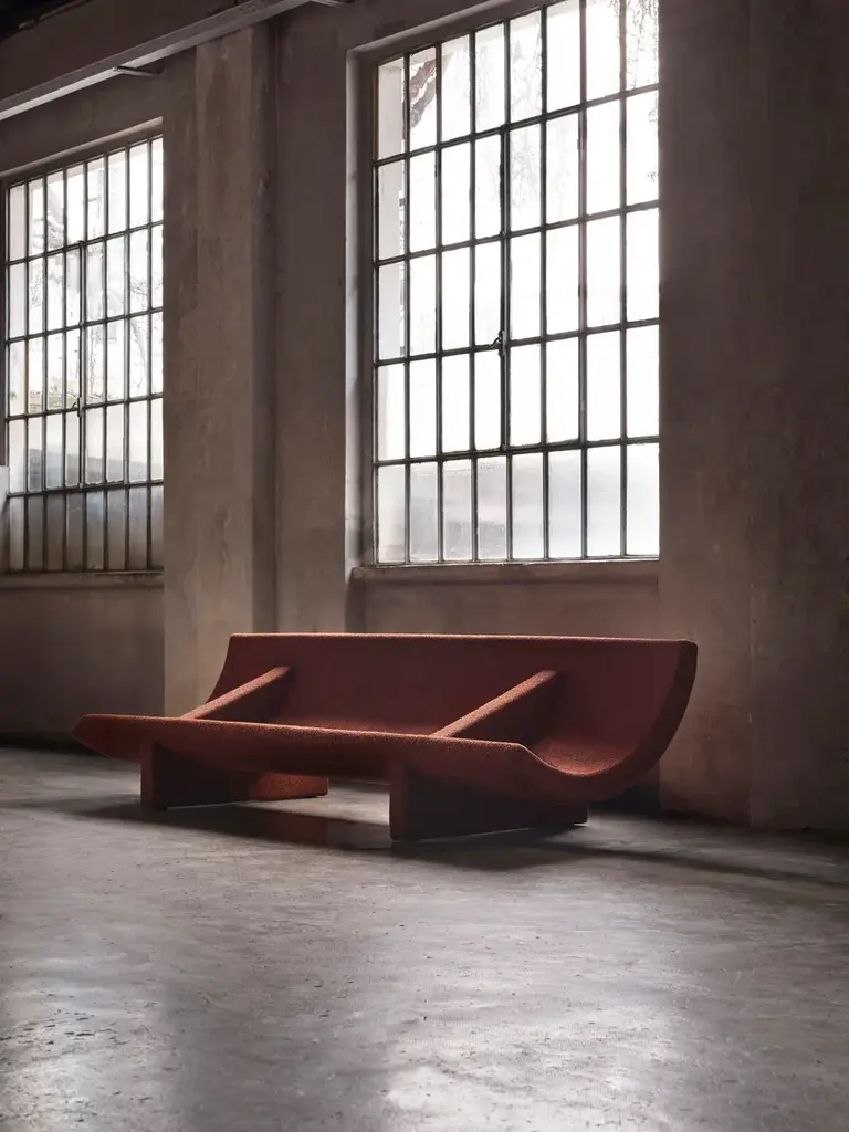 TRENCH is a sofa that reinterprets the concept of upholstery with new proportions.Its essential and ancestral shape, almost sculptural, surprises with its extraordinary comfort, defined by a single fluid curve that forms both the seat and the backrest.Fully upholstered, from the structure to the base, it stands out for its visual lightness, emphasized by its suspended configuration, raised on two sturdy legs perpendicular to the frame.The armrests, perfectly integrated, are available in a fixed version or as independent elements, which can be freely positioned to provide a customized comfort experience.