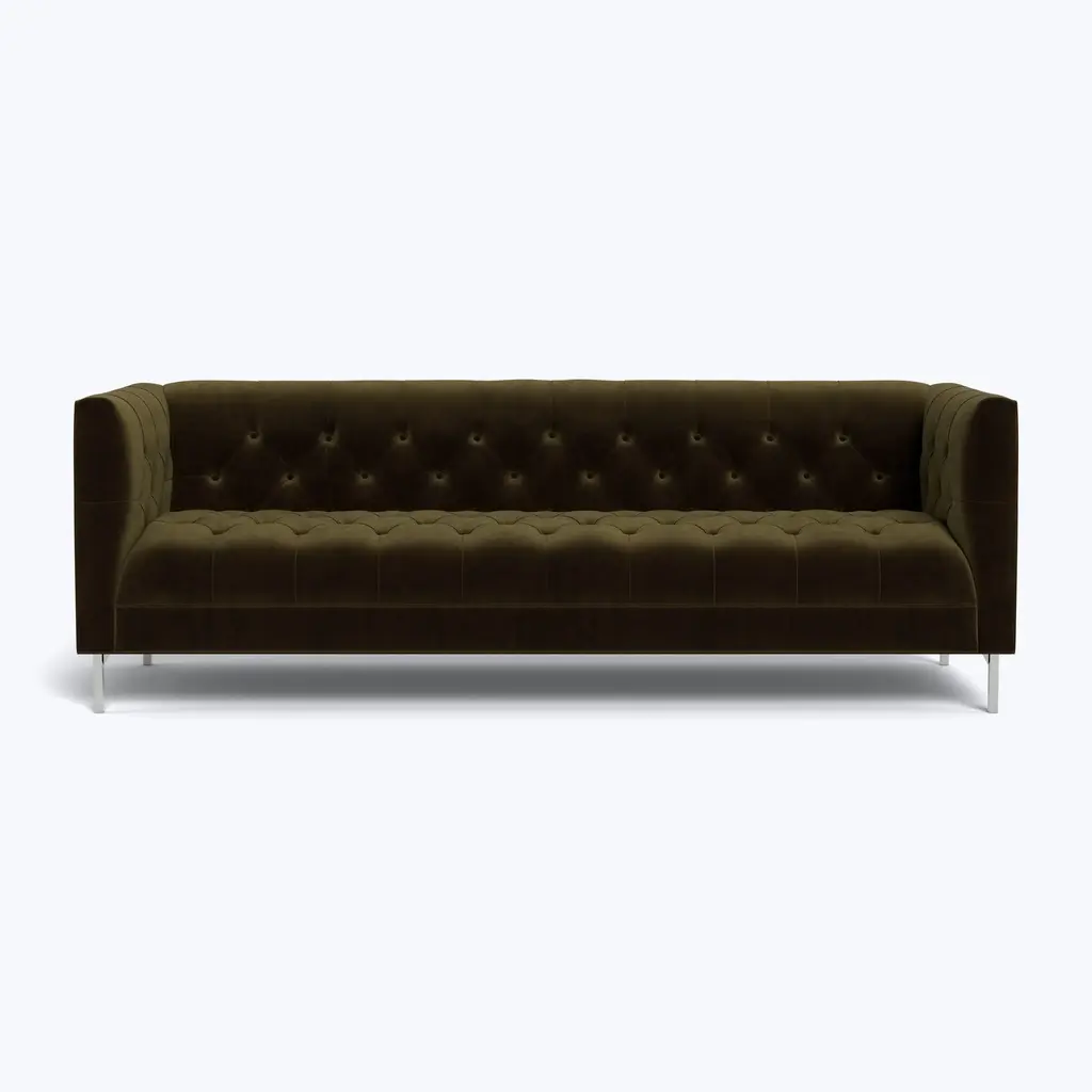 Elevate your living space with the Tribeca Sofa, an exclusive offering from abc carpet & home. Featuring clean lines and a tuxedo-like aesthetic paired with square arms and sleek legs, this contemporary sofa exudes a sense of refined luxury that effortlessly complements any decor. The Tribeca Collection goes beyond aesthetics to prioritize your comfort. This collection features tight seat cushions, exuding a formal aesthetic while providing unparalleled comfort atop a balanced suspension base. Crafted with a sustainably sourced Goodwood frame, this sofa is not only aesthetically pleasing but also eco-conscious, offering peace of mind as you create lasting memories at home. Customize your Tribeca Sofa with Cobble Hill's wide range of color and fabric combinations, offering more than 80 options to suit your unique style and preferences. Whether it's the Crypton Performance Blend or Kelley Performance Velvet, rest assured that each upholstery option is durable and easy to clean. From bold hues to subtle tones, our wide selection ensures that your sofa reflects your unique taste and personality. Simply select your dream color and fabric scheme, and your custom sofa will be shipped to your home in 8-10 weeks. Available in 74" and 84" styles, the Tribeca Sofa ensures that you have a spacious and inviting seating area for relaxation and socializing. Additionally, choose between brass and silver leg finishes to perfectly match your interior style. Proudly made in the USA, each piece in the Cobble Hill collection reflects a commitment to quality craftsmanship and ethical manufacturing practices. Maintaining the pristine condition of your sofa is effortless with simple care instructions. Spot clean with mild detergent and vacuum frequently to keep it looking fresh. For a deeper clean, professional services are recommended. The seat cushions of the Tribeca Sofa are crafted with a blend of foam, fiber, and feather/down, channeled to ensure even fill distribution. Back cushions feature a fiber and feather blend encased in a channeled down-proof casing. Rest assured, our fill is Responsible Down Standard certified and meets USDA hypoallergenic regulations, free from flame retardant chemicals. Whether used as a standalone centerpiece or paired with other Tribeca chairs and sofas to create a unique ensemble, the Tribeca Sofa from Cobble Hill is sure to make a lasting impression in your home.