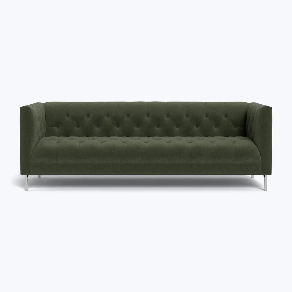 Elevate your living space with the Tribeca Sofa, an exclusive offering from abc carpet & home. Featuring clean lines and a tuxedo-like aesthetic paired with square arms and sleek legs, this contemporary sofa exudes a sense of refined luxury that effortlessly complements any decor. The Tribeca Collection goes beyond aesthetics to prioritize your comfort. This collection features tight seat cushions, exuding a formal aesthetic while providing unparalleled comfort atop a balanced suspension base. Crafted with a sustainably sourced Goodwood frame, this sofa is not only aesthetically pleasing but also eco-conscious, offering peace of mind as you create lasting memories at home. Customize your Tribeca Sofa with Cobble Hill's wide range of color and fabric combinations, offering more than 80 options to suit your unique style and preferences. Whether it's the Crypton Performance Blend or Kelley Performance Velvet, rest assured that each upholstery option is durable and easy to clean. From bold hues to subtle tones, our wide selection ensures that your sofa reflects your unique taste and personality. Simply select your dream color and fabric scheme, and your custom sofa will be shipped to your home in 8-10 weeks. Available in 74" and 84" styles, the Tribeca Sofa ensures that you have a spacious and inviting seating area for relaxation and socializing. Additionally, choose between brass and silver leg finishes to perfectly match your interior style. Proudly made in the USA, each piece in the Cobble Hill collection reflects a commitment to quality craftsmanship and ethical manufacturing practices. Maintaining the pristine condition of your sofa is effortless with simple care instructions. Spot clean with mild detergent and vacuum frequently to keep it looking fresh. For a deeper clean, professional services are recommended. The seat cushions of the Tribeca Sofa are crafted with a blend of foam, fiber, and feather/down, channeled to ensure even fill distribution. Back cushions feature a fiber and feather blend encased in a channeled down-proof casing. Rest assured, our fill is Responsible Down Standard certified and meets USDA hypoallergenic regulations, free from flame retardant chemicals. Whether used as a standalone centerpiece or paired with other Tribeca chairs and sofas to create a unique ensemble, the Tribeca Sofa from Cobble Hill is sure to make a lasting impression in your home.