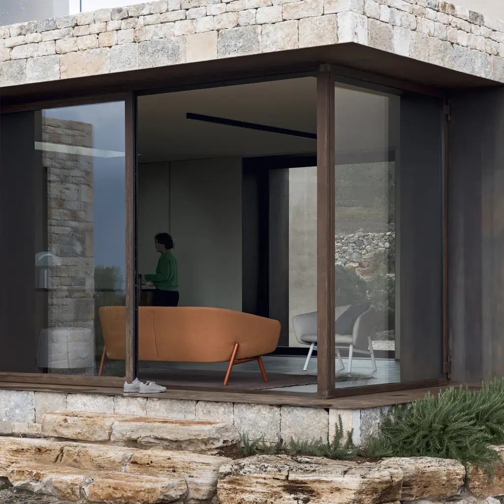 Designed by Patrick Norguet, the Tuile collection gets its name from a traditional French biscuit, as it is narrow with an arched shape like the backrest of these upholstered items. The Tuile collection includes an armchair, a 2-seater sofa and a 3-seater sofa with a light painted metal frame and a curved comfortable seat with polyurethane foam padding. The upholstery is made of fabric or leather, including the option of combining two different finishes for the front and back, and can be freely matched with the colours of the frame. With its tailored workmanship and a multitude of colours available, Tuile is ideal in the living room and in all rooms in the home dedicated to relaxation. It is also suitable for outdoor living , the finish cover is made of Heritage® fabric (Kvadrat): stain-resistant, breathable, UV-resistant and water-repellent.