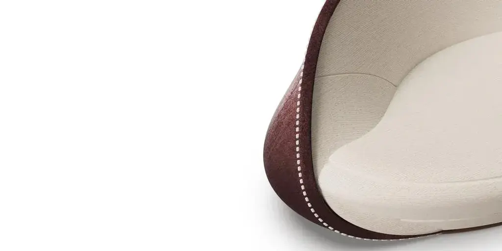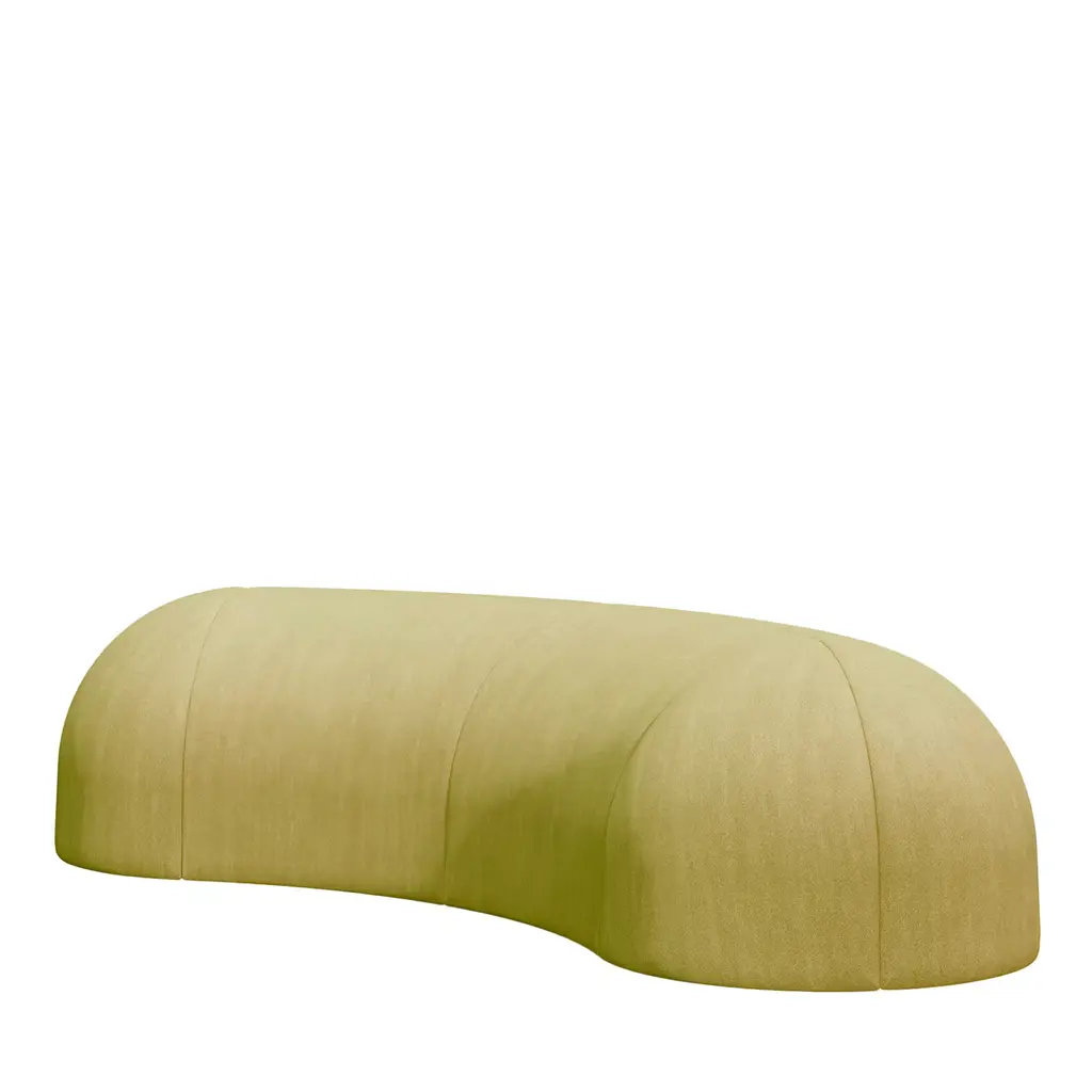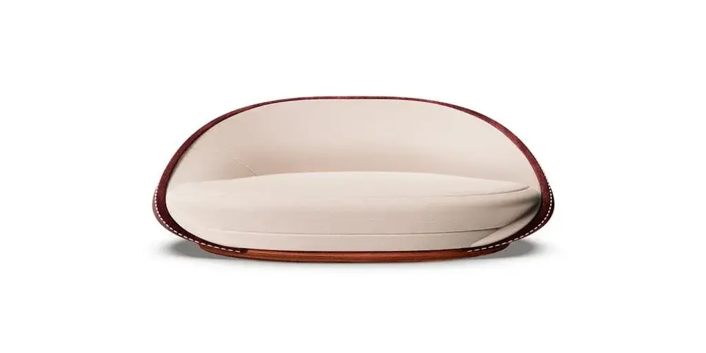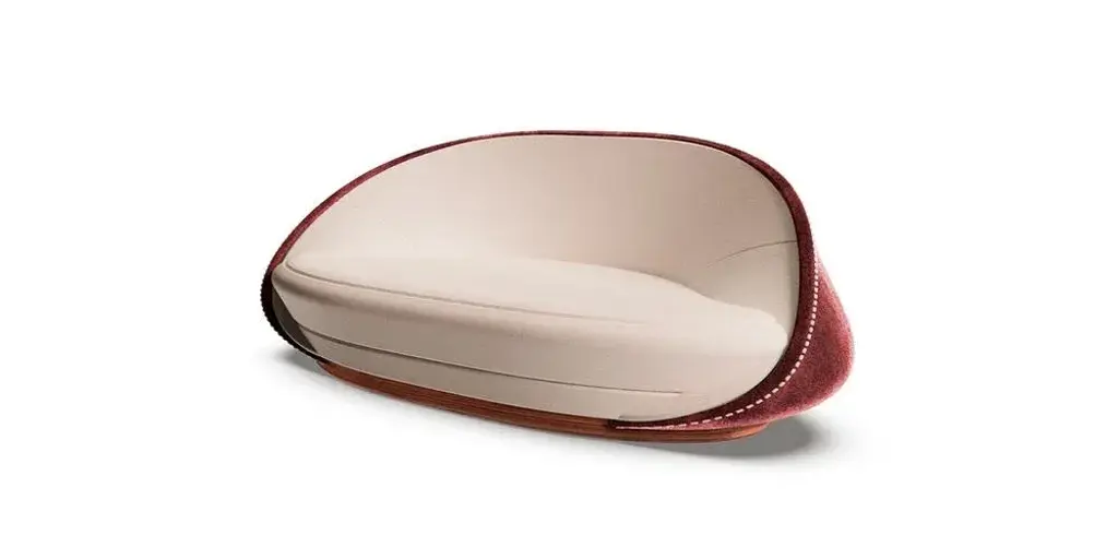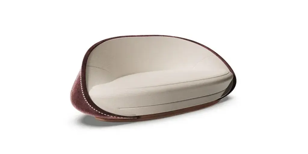 The design features a look based on the juxtaposition of colors: on one side there is deep color, which follows the curve of the enveloping backrest and on the other side there is the fabric of the cushions, with its haute couture feel. Labeled by Maker