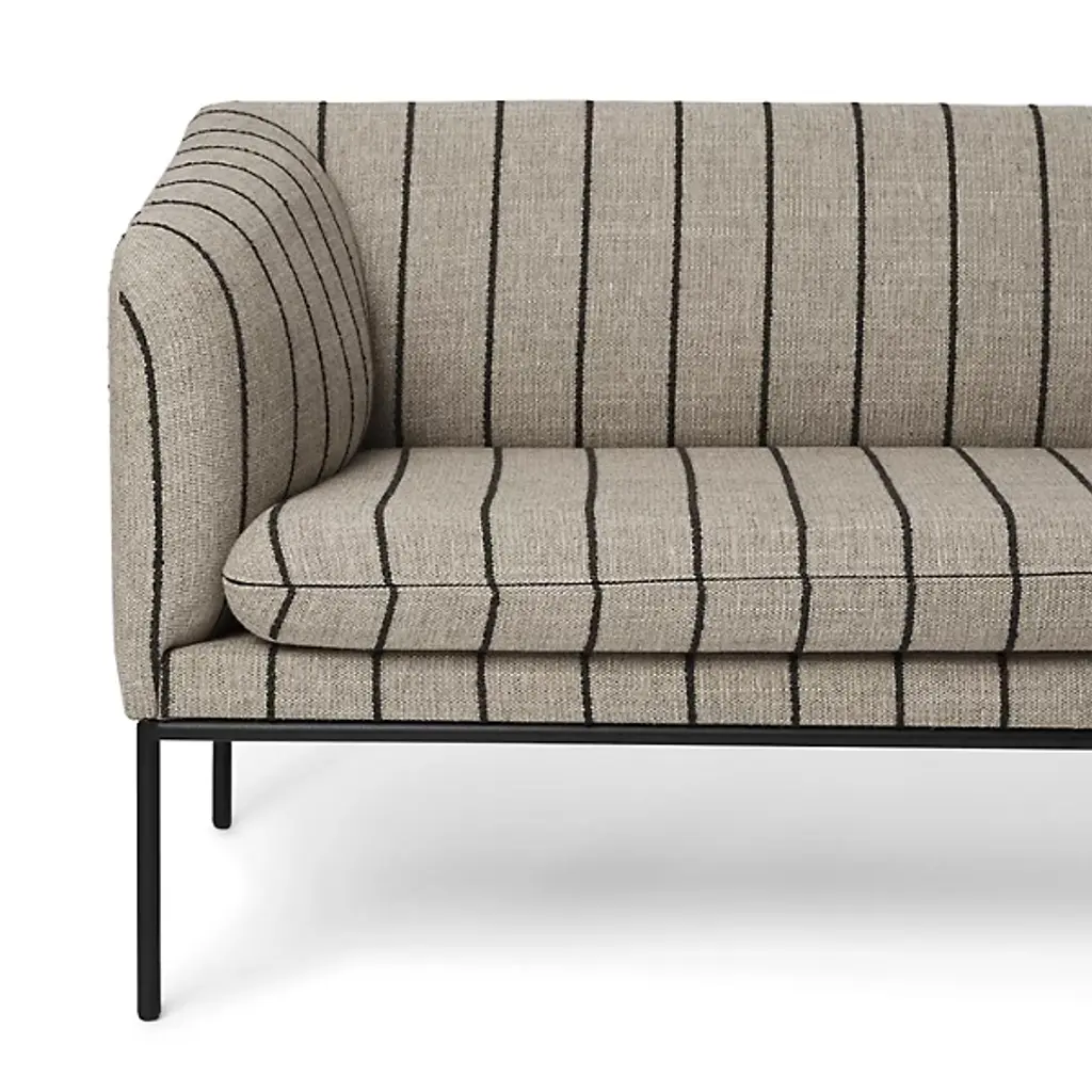 The Turn 3-Seater Sofa from Ferm Living features a striking sculptural exterior that contrasts beautifully with its inviting, organically curved interior. The oversized stripe pattern of our Made to Order 'Pasadena' fabric adds a classic touch, making it a perfect fit for any interior space. The sofa boasts a timeless and clean aesthetic with its tight upholstery and simple powder-coated metal frame. The soft inner curves and warm materials lend a feminine touch, balancing the design with elegance and comfort.