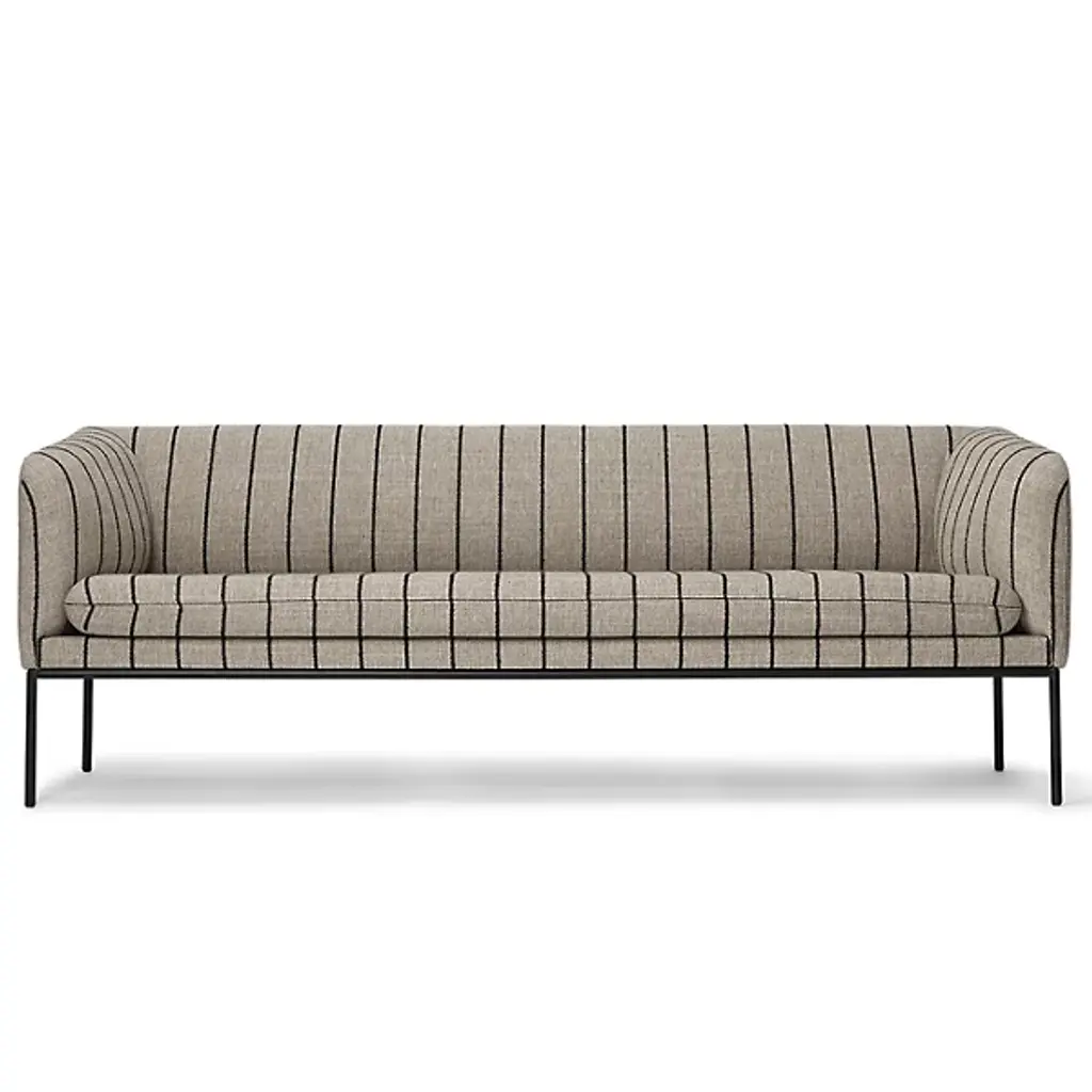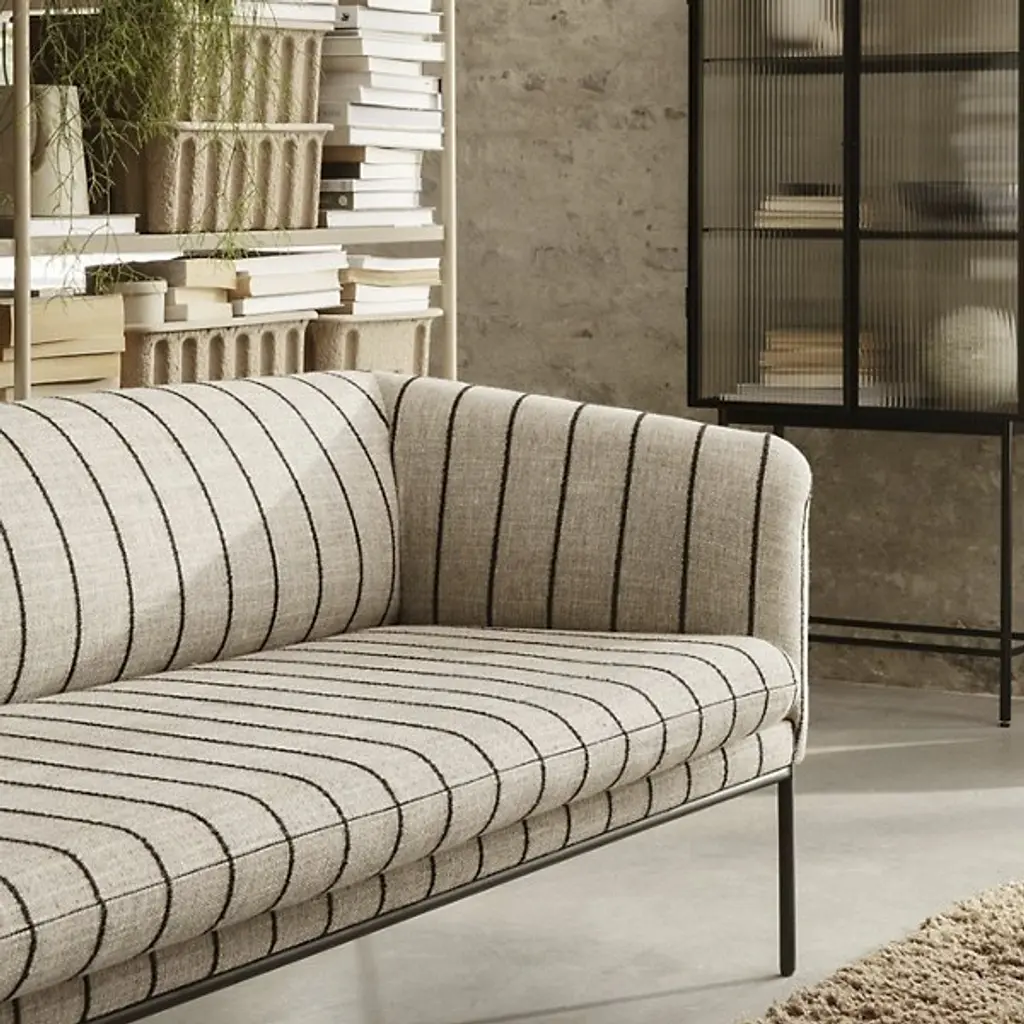The Turn 3-Seater Sofa from Ferm Living features a striking sculptural exterior that contrasts beautifully with its inviting, organically curved interior. The oversized stripe pattern of our Made to Order 'Pasadena' fabric adds a classic touch, making it a perfect fit for any interior space. The sofa boasts a timeless and clean aesthetic with its tight upholstery and simple powder-coated metal frame. The soft inner curves and warm materials lend a feminine touch, balancing the design with elegance and comfort.
