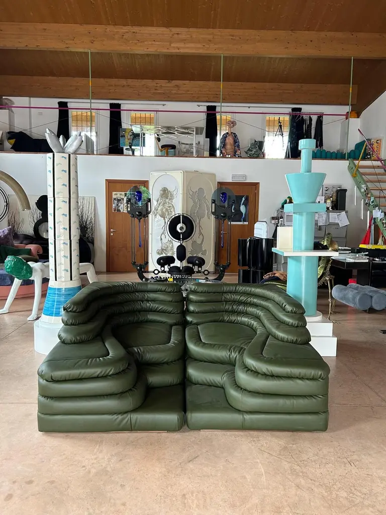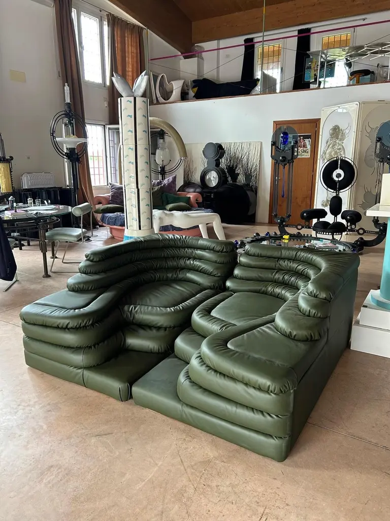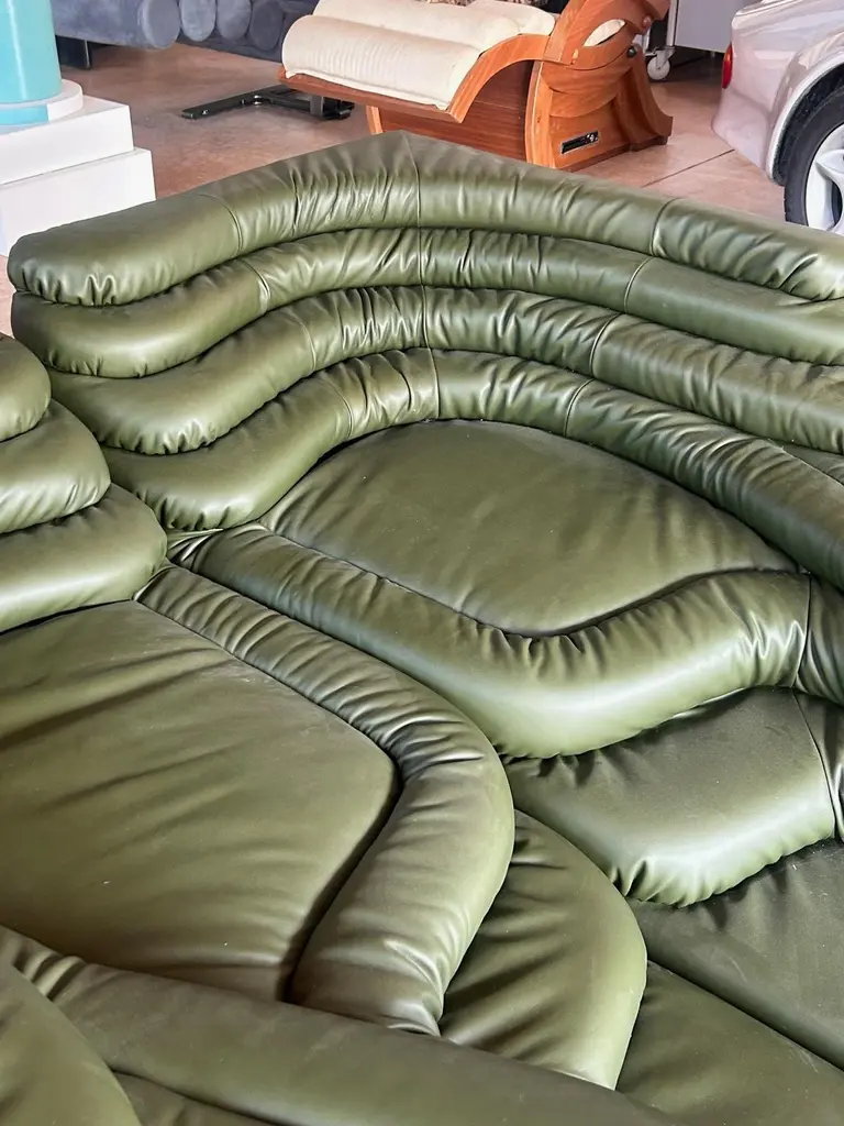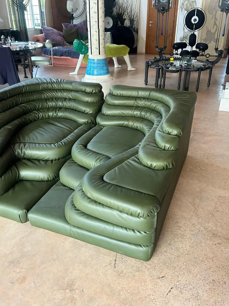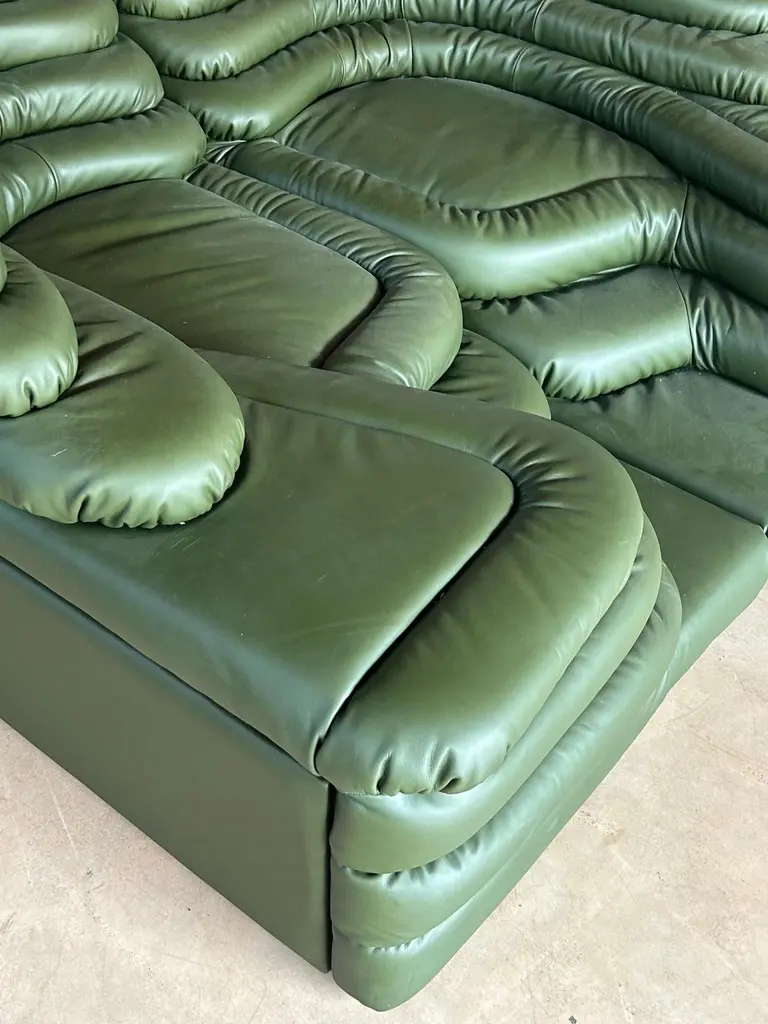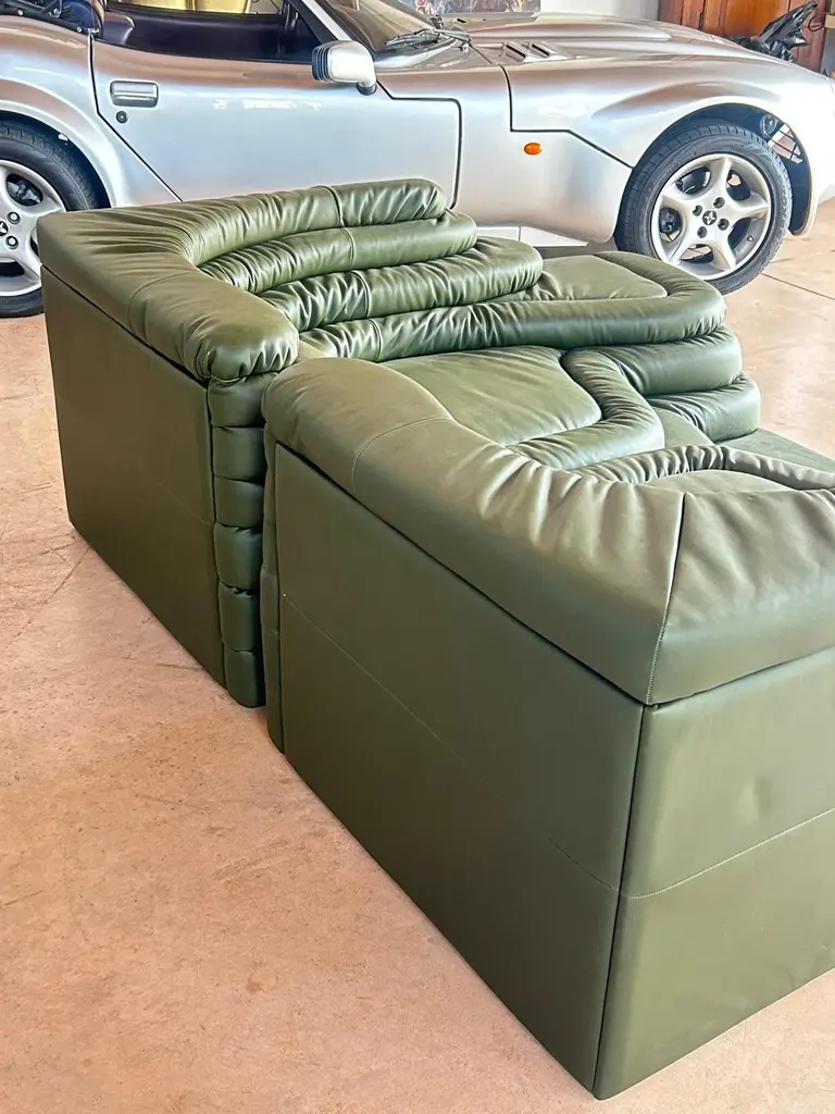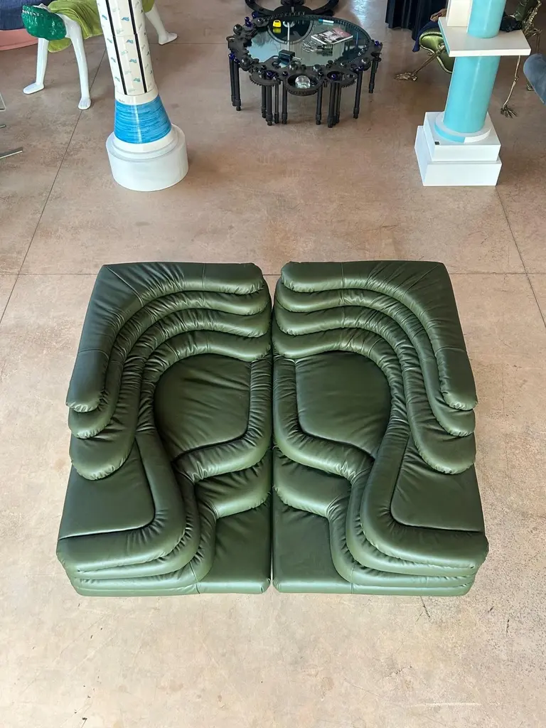 A pair of DS-125 Terrazza sofa in green leather designed by Ubald Klug for De Sede in the seventies. The shapes inspired by nature of this sofa combined with the great quality of construction make it a real seat work of art.