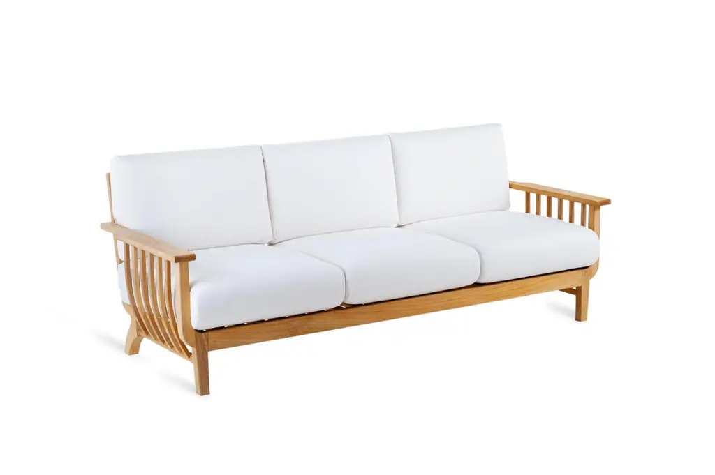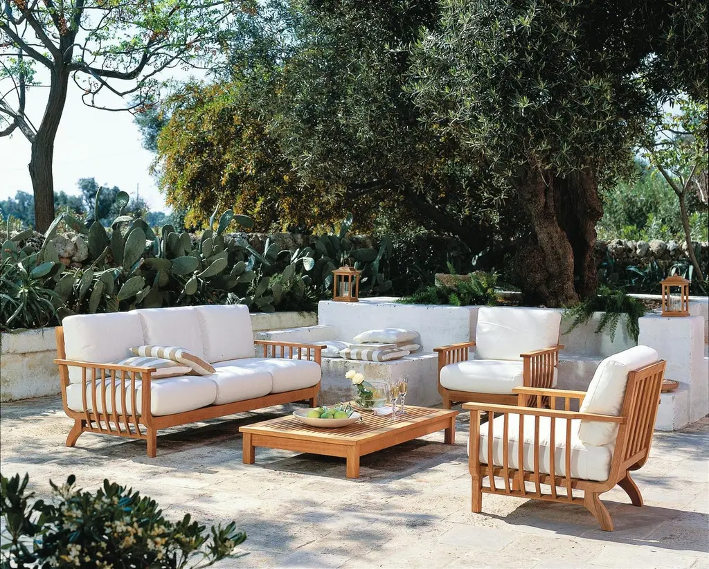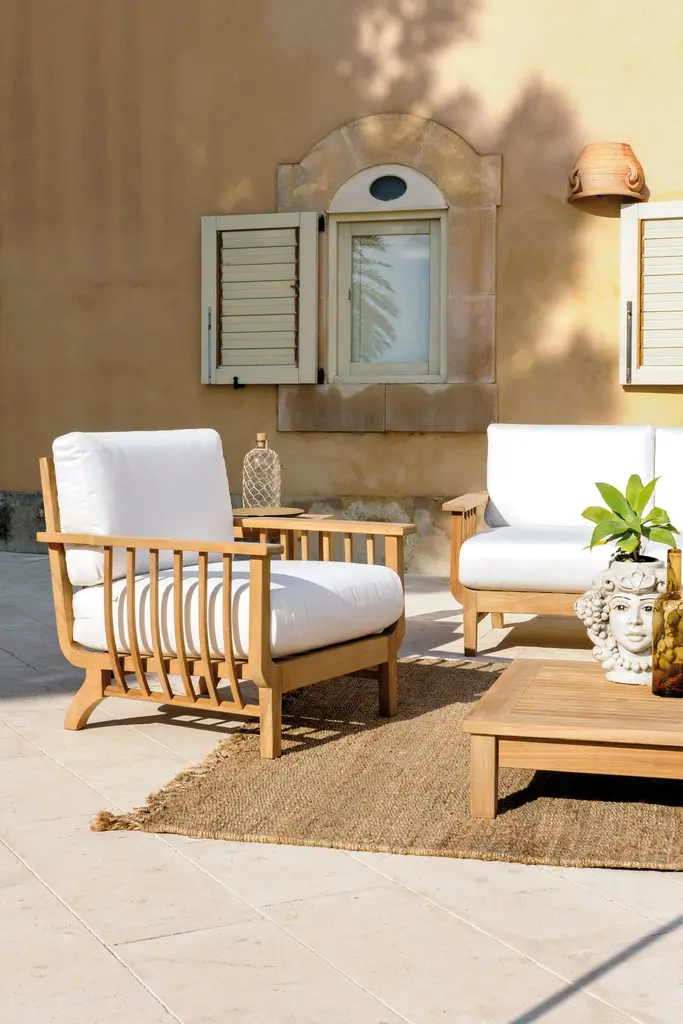 The Chelsea line is classic and traditional, entirely made of honey-coloured teak, a shade that enhan- ces the naturalness and warmth of the material. This highly articulated collection includes sofas, tables, chairs, loungers and deck chairs, allowing the outdoor space to be transformed into a wel- coming, familiar landscape.The sofa and armchair stand out due to their solid shapes and harmonious forms, which enhance the technical and aesthetic characteristics of the teak. The coffee table is characterised by a pattern of elegant horizontal slats, which lighten the compact, basic structure.Available also in 3 seats:82.28 / 33.46 / 32.28in