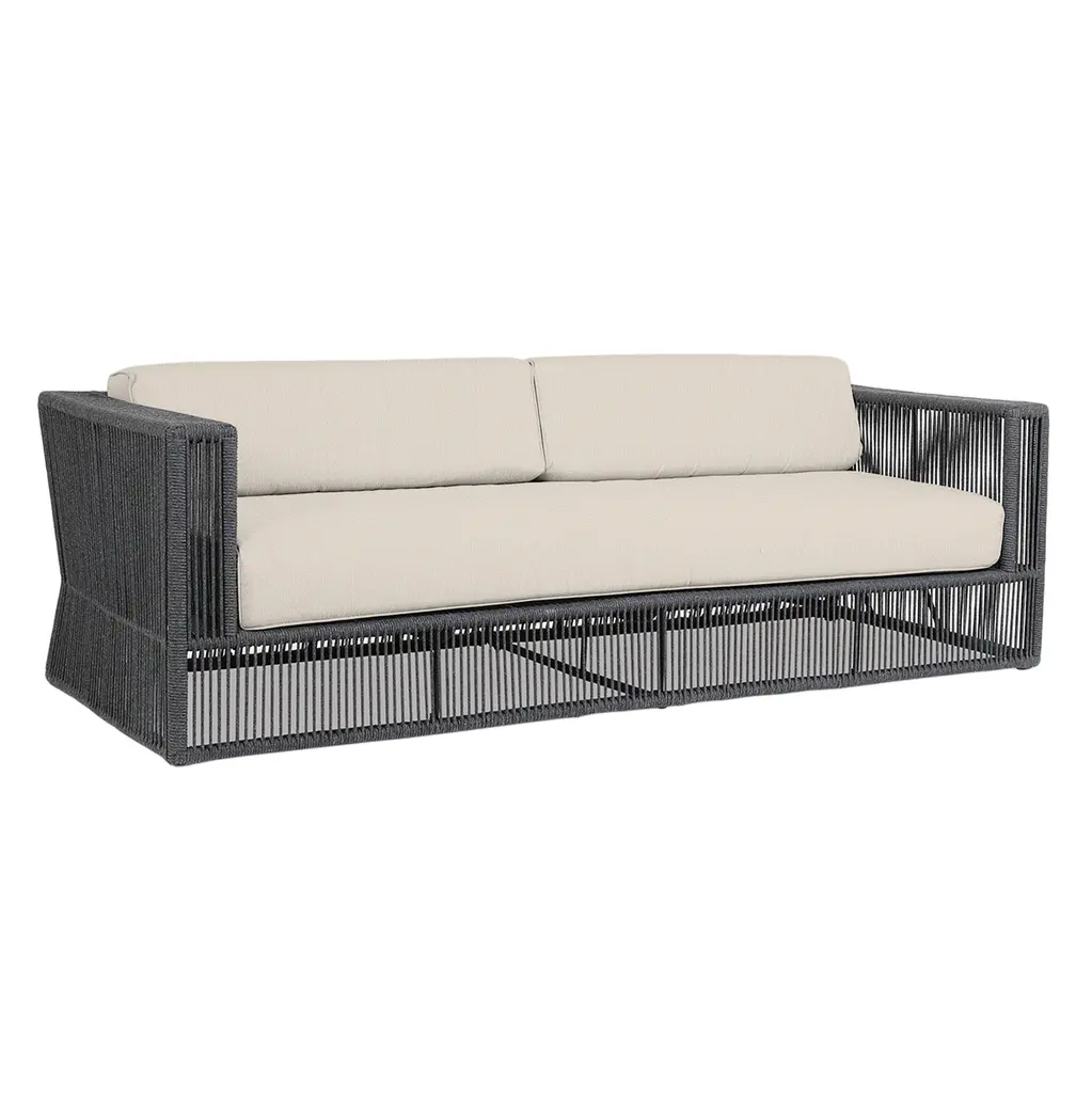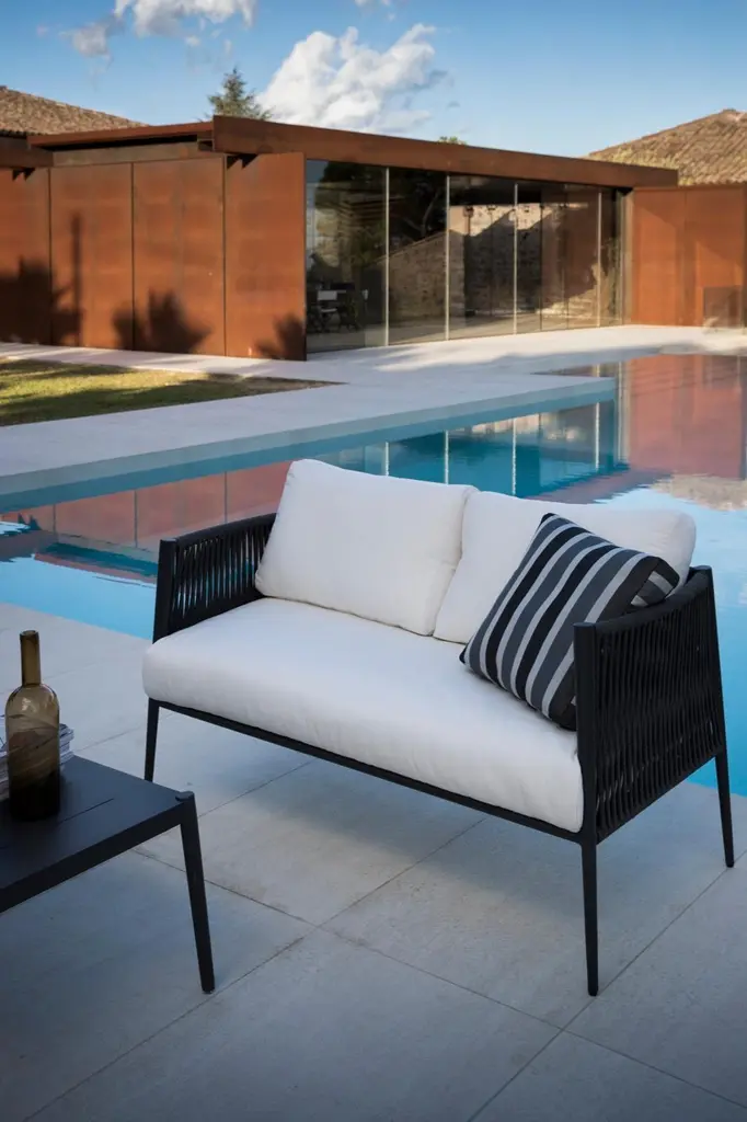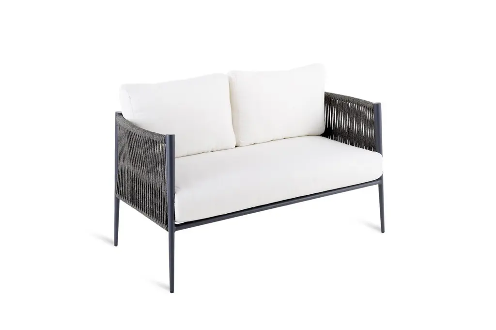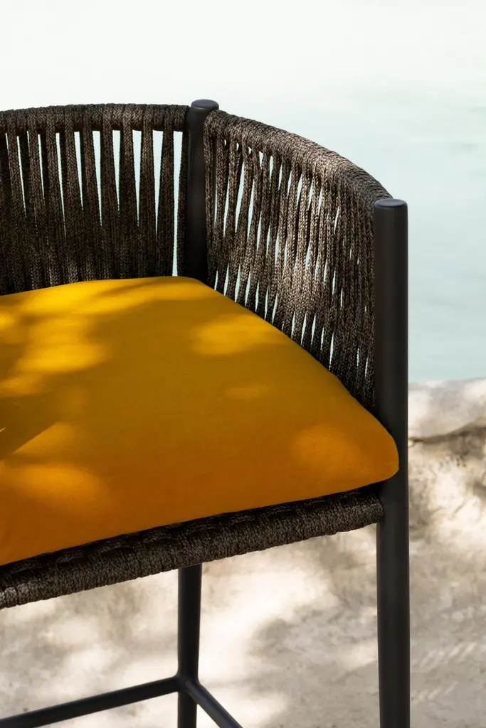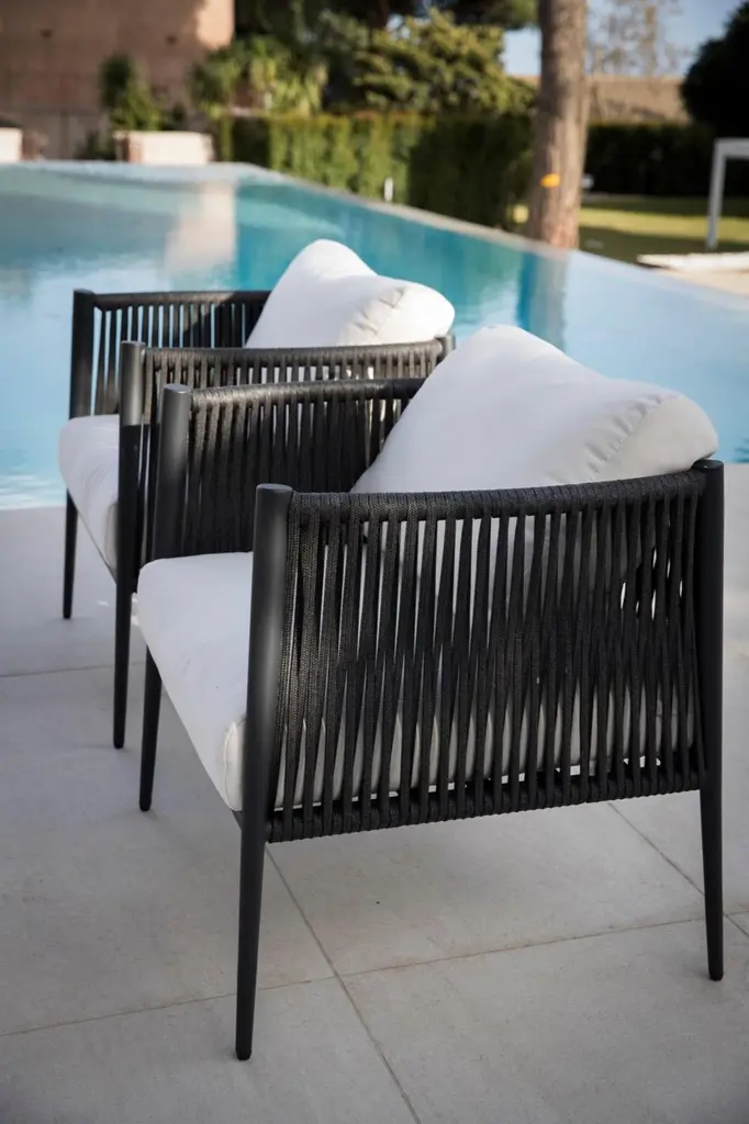 The encounter of the frame made from alumini- um and the synthetic rope covering the armrests and backrest has produced Luce, a name inspired by the lighting effects generated by the combination of the two materials.The tapered legs, which become even more slender at the ends, are a feature of the line, conferring a sense of lightness to the furnishings without sacrificing the stability and solidity guaranteed by the alu- minium.CUSHION NOT INCLUDED