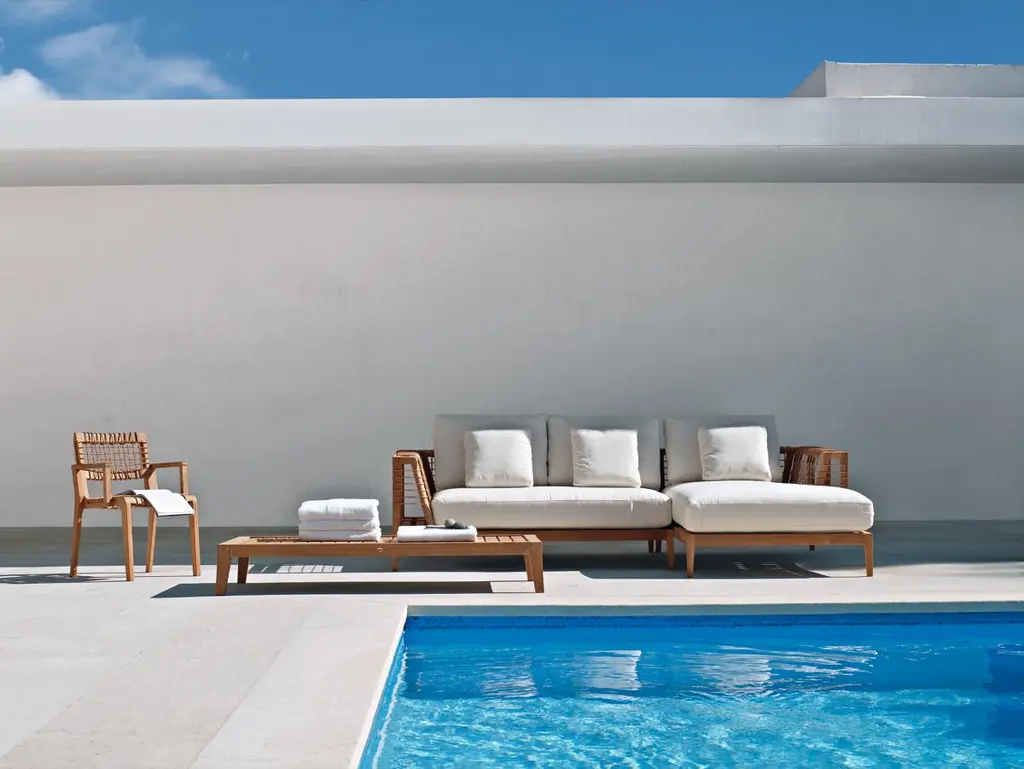 Synthesis is a contemporary collection with a basic design, where the purity of the lines is conveyed through an elegant combination of teak and hand-woven WaProlace® synthetic fibre.Craftsmanship and attention to detail are the distinctive traits of the many products in the collection.The wide mesh weave of the fibre combines functionality and aesthetics in a discreet, sophisticated pattern designed to harmoniously complement the natural space.Available in different combination.Please enquire with us.