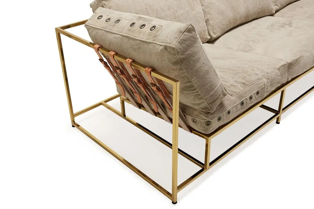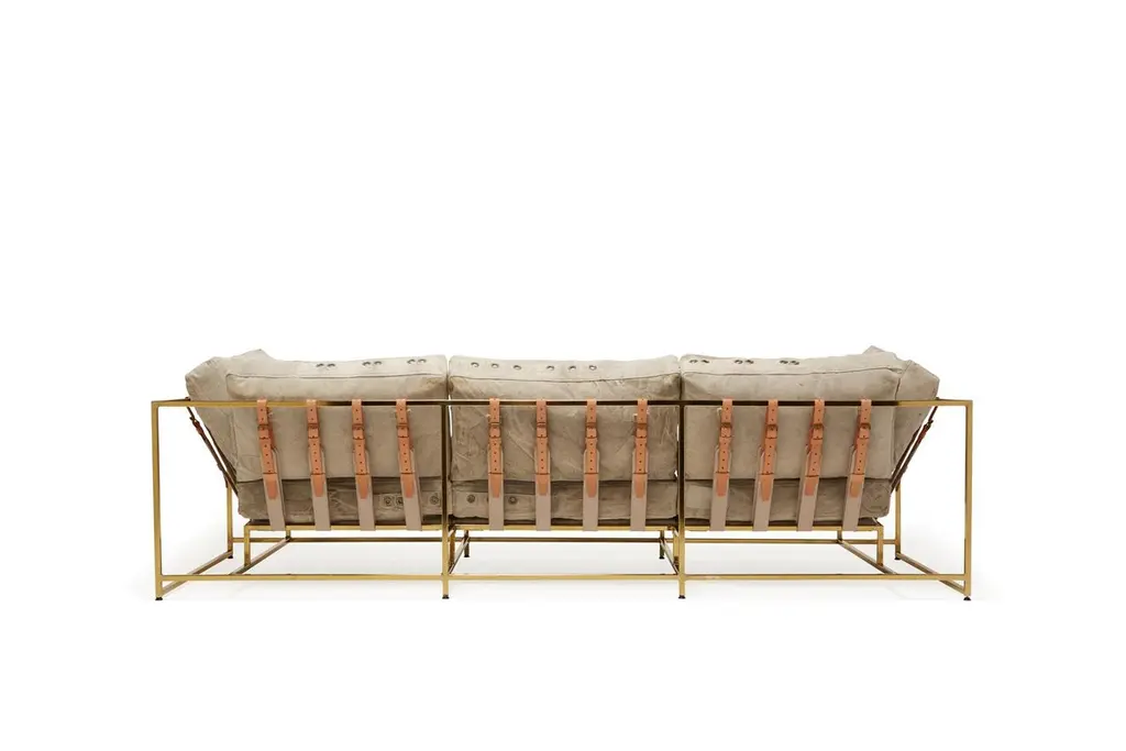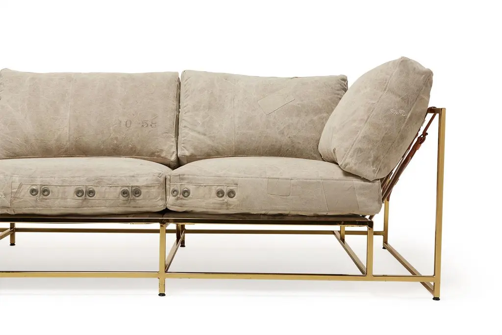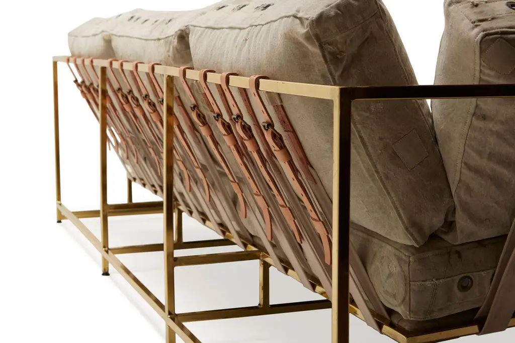 The Inheritance sofa by Stephen Kenn is as comfortable as it is unique. The design features an exposed construction composed of three elements - a steel frame, plush upholstery, and supportive belts. The deep seating area is perfect for a relaxing lounge experience. This sofa comes with removable cushion covers to allow for easy cleaning should the need arise. Every Stephen Kenn piece is made to order through our Los Angeles studio in partnership with a number of small businesses and fabricators in the LA area. With this highly customizable sofa you can select from a wide range of finishes and materials to complement your home and lifestyle - please message us to see our Customization Guide with all available options.Since the development of the Inheritance Collection, Stephen Kenn has been inspired by the history inherent in vintage military-issue materials. This version of our Inheritance Sofa is upholstered with salvaged vintage US mailbag canvas material. Each piece of canvas is distinctive and will have unique attributes from its long history of use, including small imperfections, stamps, lettering, patches, or markings from the soldiers who used them, as well as shade variations in greys and cream. The foam seat cushions have been wrapped in polyfiber for added softness and comfort. Sitting atop a polished brass frame, the sofa is strapped with support belts featuring light grey cotton webbing, natural veg tan leather, and antique brass buckles.