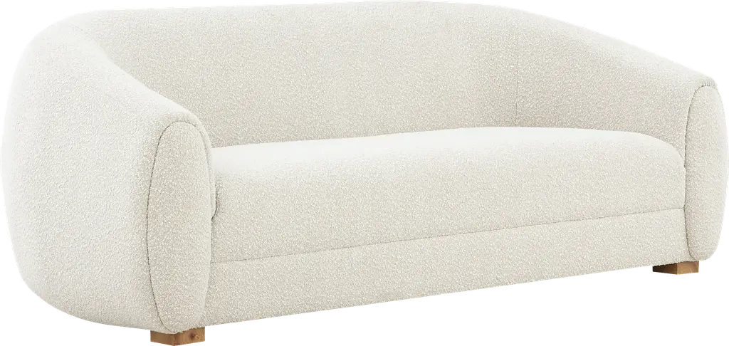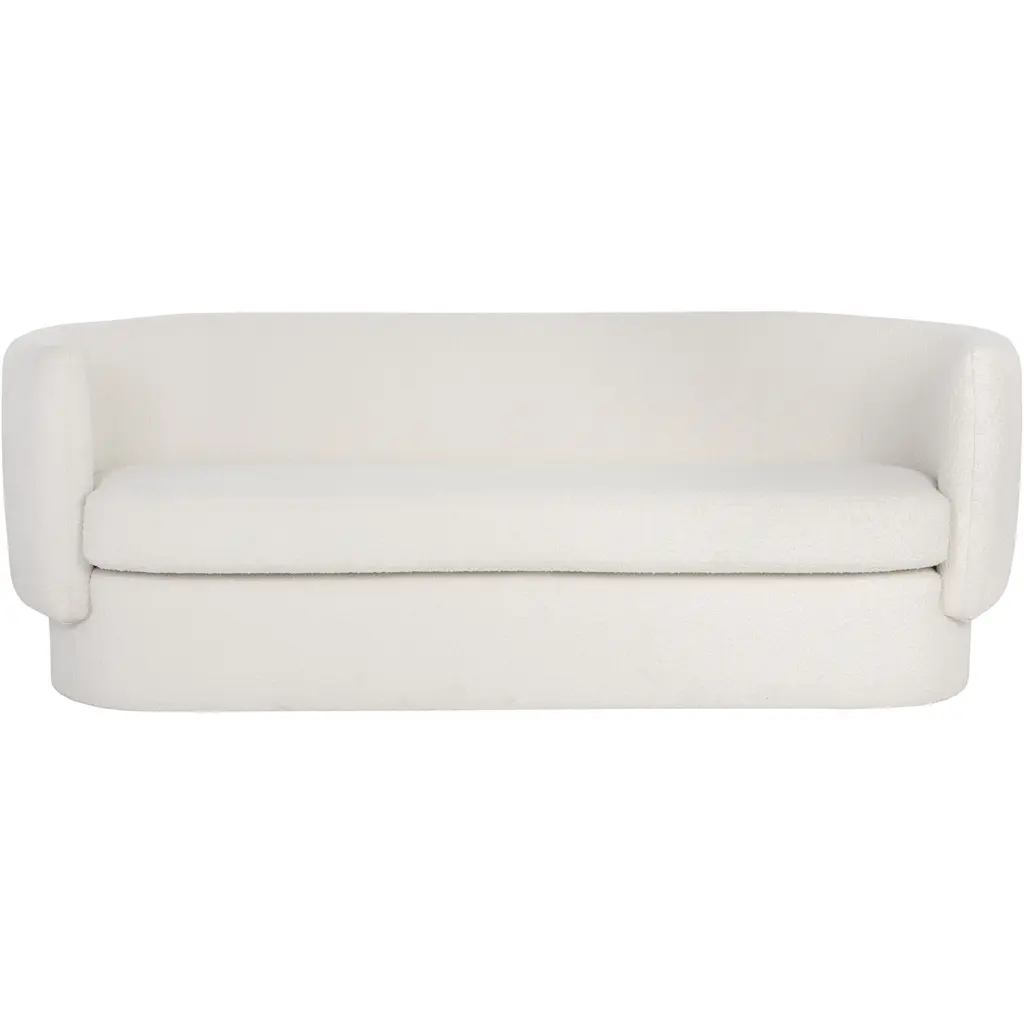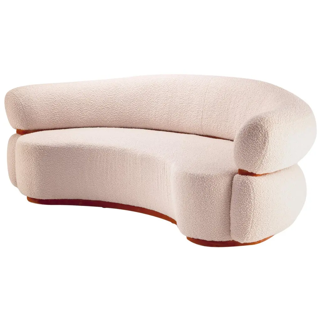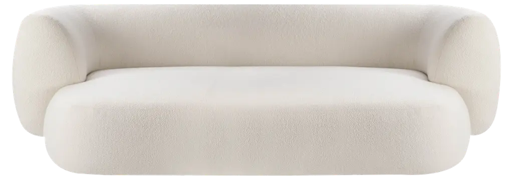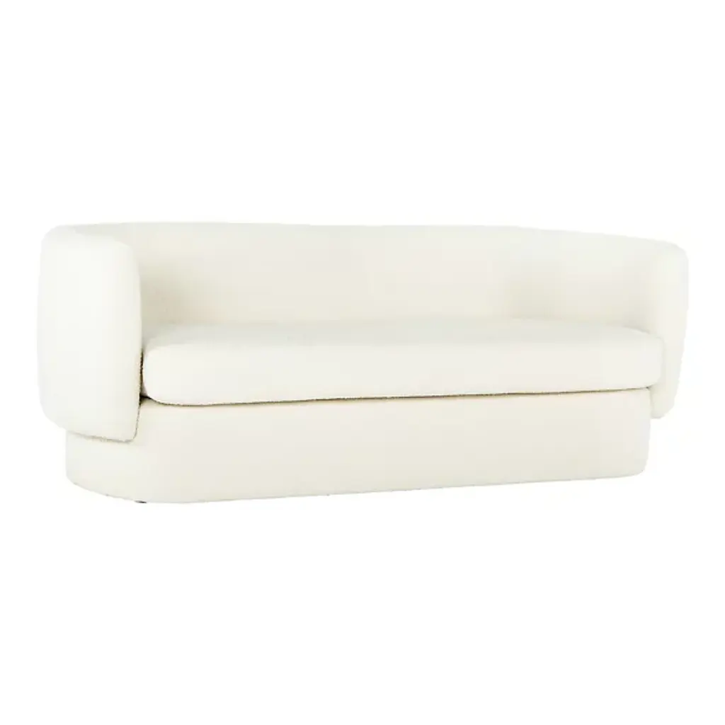 Evoke a stylish flair with this curved, contemporary sofa. Features a capsule shaped frame in maya white fabric. Maya fabric features a boucle texture. Eye-catching from all angles. Coordinating armchair also available.