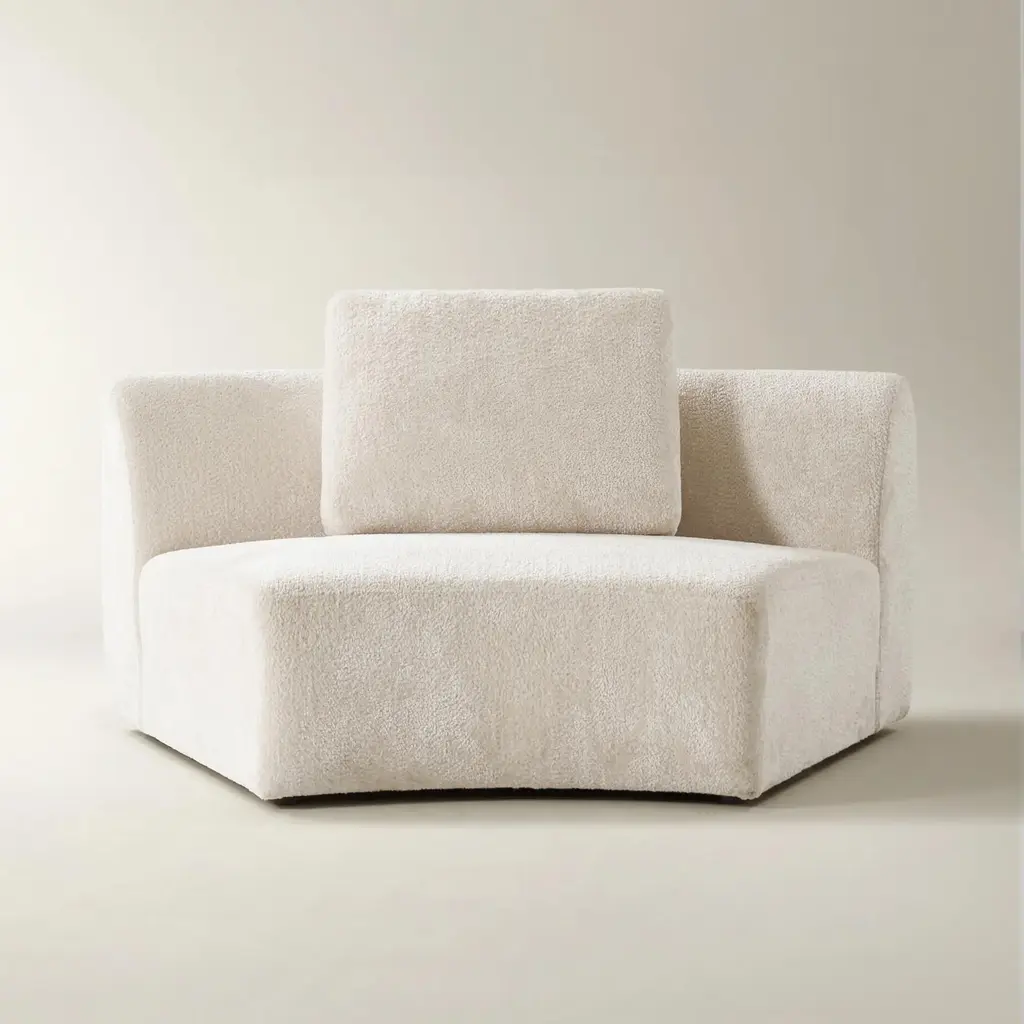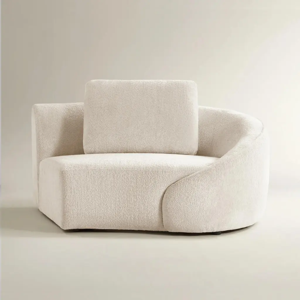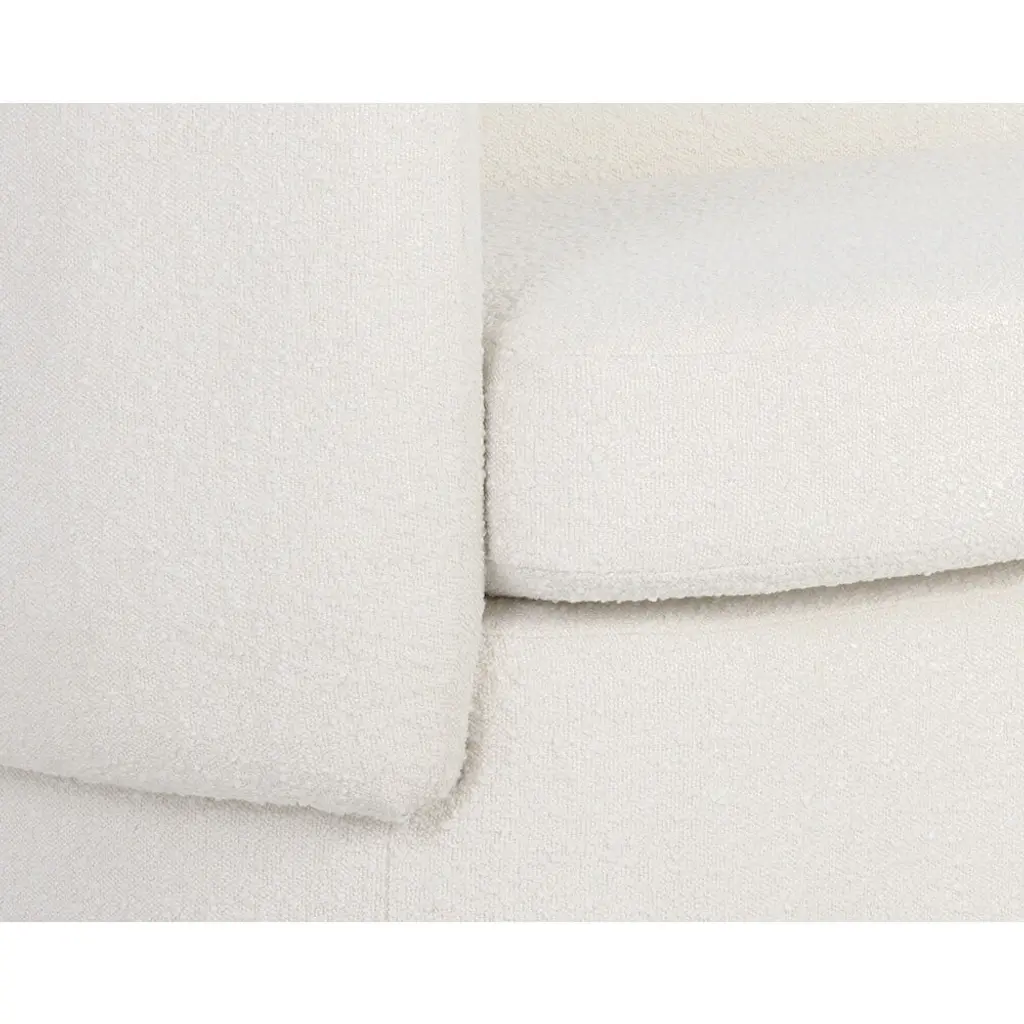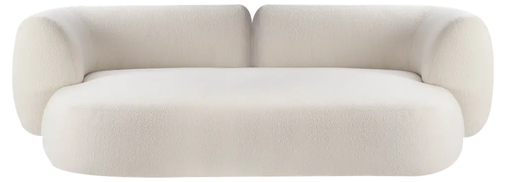 Evoke a stylish flair with this curved, contemporary sofa. Features a capsule shaped frame in maya white fabric. Maya fabric features a boucle texture. Eye-catching from all angles. Coordinating armchair also available.