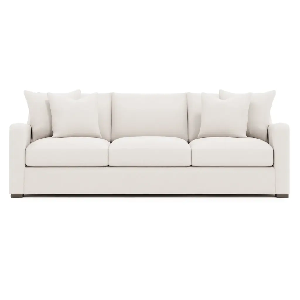 Clean lines and graceful curves blend modern and traditional shaping for the Ventura sofa. The arms gently swoop from a tall back and then take a straight line to the floor. Three deep seat cushions and box-edge bordered back pillows provide the ultimate in comfort.