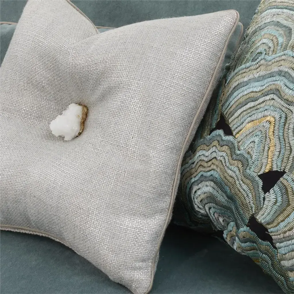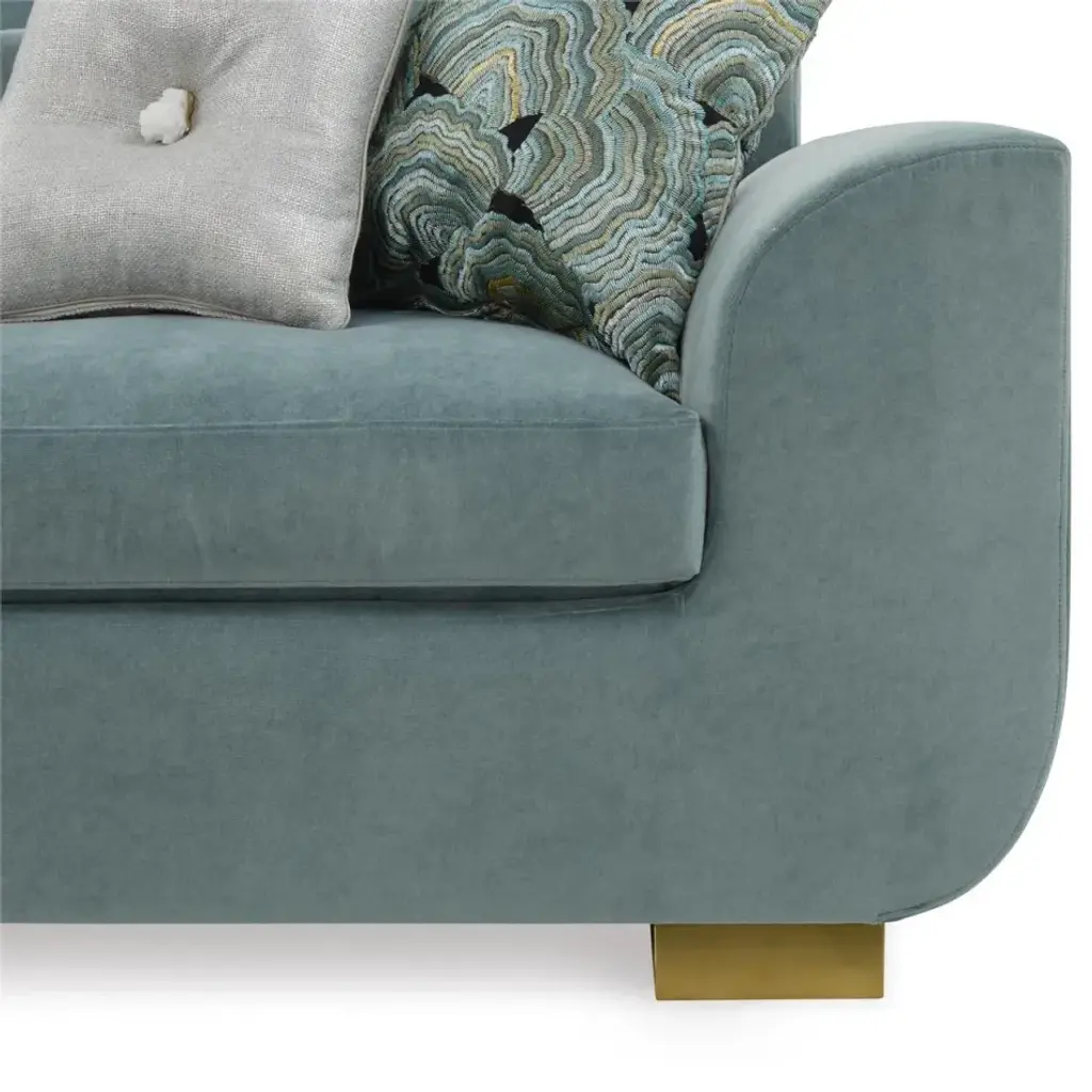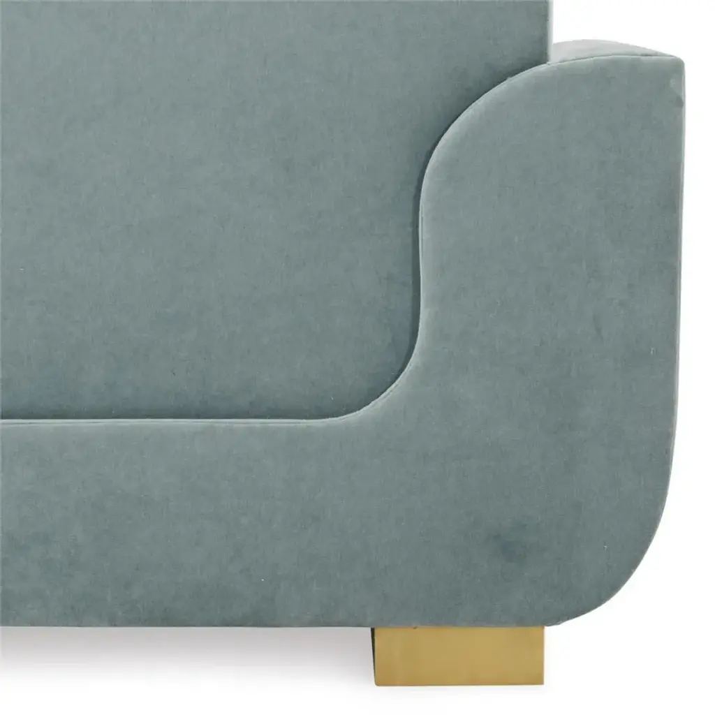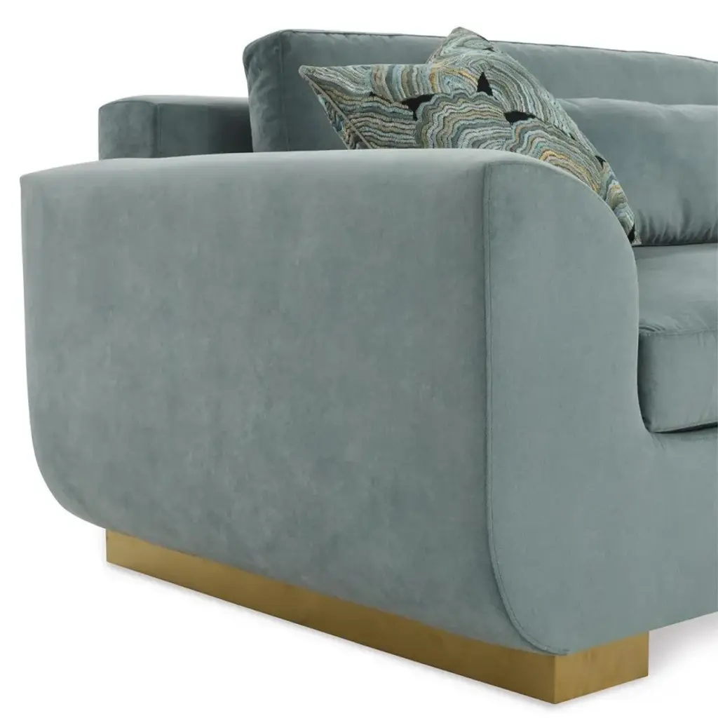 The Venturi Sofa is a gorgeous blend of smoothed edges and sharp angles, creating a timeless look that captures a space. Thick stainless-steel legs with a brushed brass finish run the width of the piece to support the acacia wood frame, providing stunning accent tones to the upholstery in Opal 602 Capri-2225 fabric. Five throw pillows are included, coming in green, white, and silver embedded with quartz crystal.