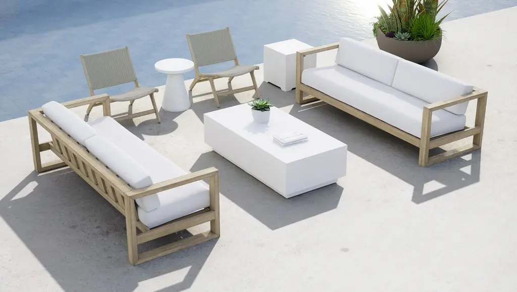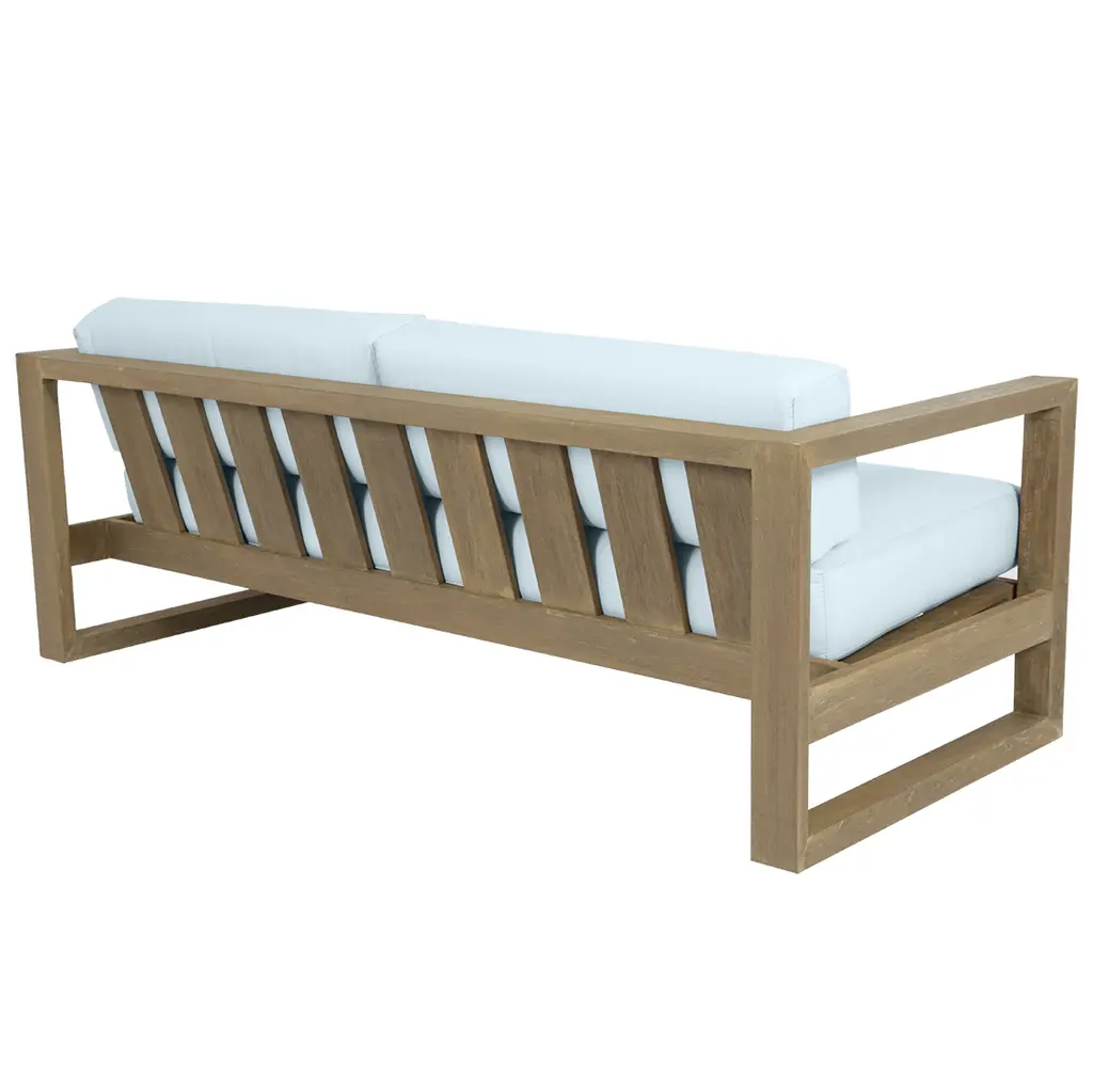The Verian Teak Sofa introduces deep seating to the signature Verian Teak group. A unique multi-step finish gives the natural wood a warm grey color, complementing other collections for a perfectly curated Verian design. Constructed of 100% solid teak wood, these excellently engineered pieces develop a lovely patina over time. Featuring a 100% natural teak wood frame and weather-resistant, high-resiliency foam cushions, this sofa is stocked in premium fabric with The versatile finish coordinates well with many collections.