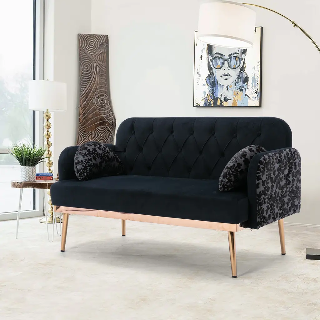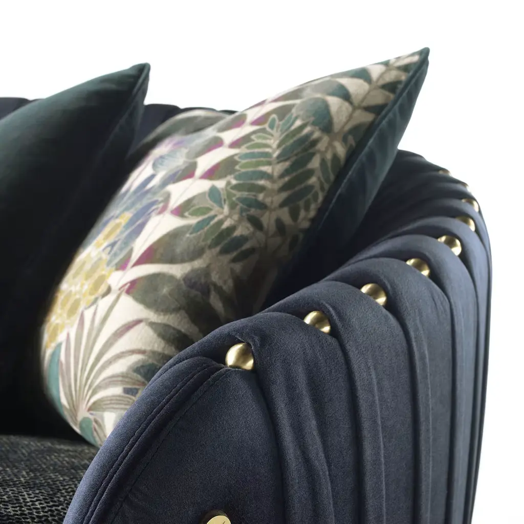 A solid wooden structure welcoming a generous polyurethane padding is the core of this stunning sofa, marked by an enveloping shell that gently slopes incorporating the armrests. Luxuriously covered in blue velvet enhanced by refined vertical pleats, it flaunts luminous metal spheres accenting its profile and matching its feet. Loose coordinated cushions seal its sophisticated allure.
