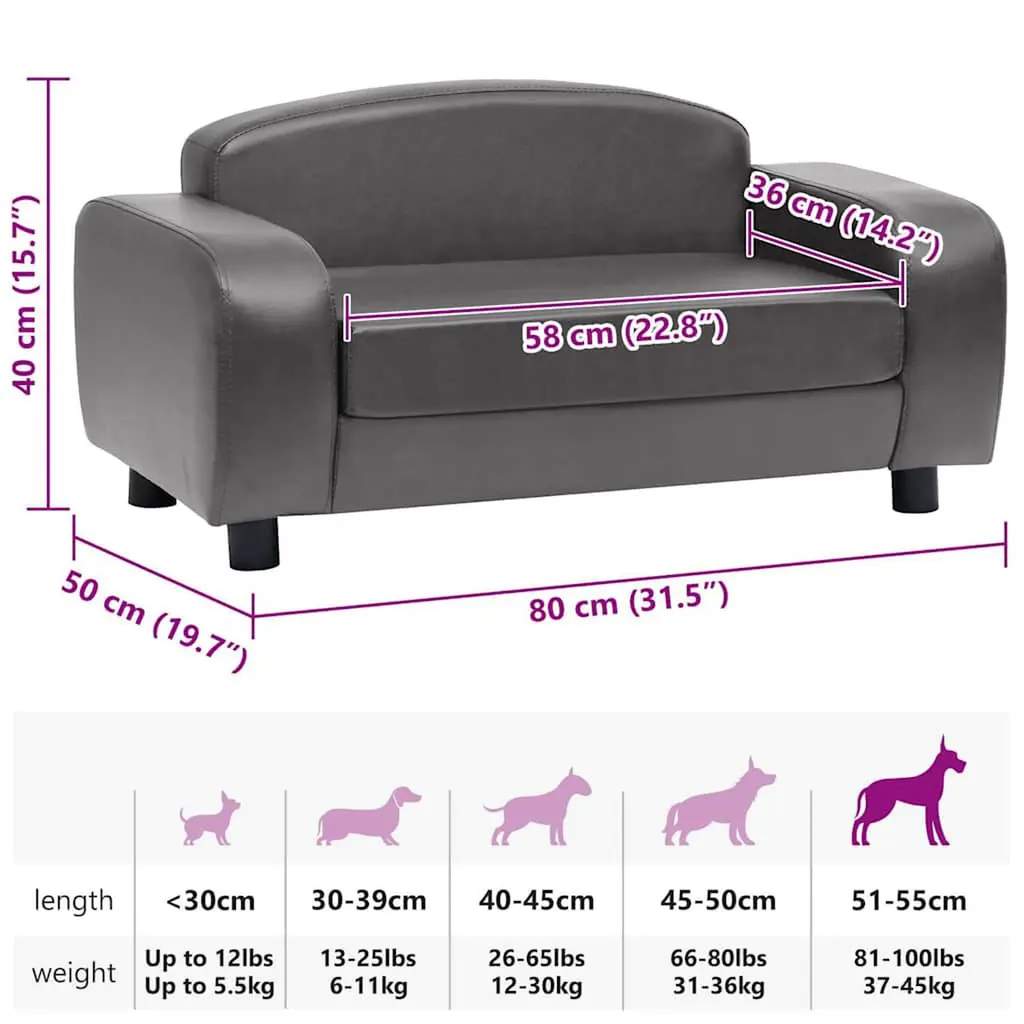 This stylish dog sofa provides a lovely retreat for your furry pals, giving them their own space to chill. Made from faux leather with solid fir wood legs, it's a comfy spot that looks great for small breeds like Beagles, French Bulldogs, and Dachshunds. Its sleek grey finish fits right into your living room or bedroom decor. Anti-Slip Base: The specially designed non-skid bottom helps prevent the sofa from sliding on hard surfaces, providing a secure lounging option for your active pet, which is especially important when they jump on or off the couch.Durable Construction: This dog sofa is expertly built to endure heavy use from pets, especially suited for small dogs or cats. Its robust design makes it perfect for both playful pups and calm cats, ensuring longevity even with daily use.Machine-Washable Features: The removable cushion cover is machine washable, allowing for easy maintenance. This feature is invaluable for pet owners, making cleaning up spills and messes hassle-free and time-efficient.Elegant Contemporary Design: The smooth, matte grey finish complements various home aesthetics, making it a lovely addition to your decor. Its rectangular shape fits perfectly in any room, offering both style and comfort.Perfect for Small Breeds: Sized at 31.5 inches in length and 19.7 inches in width, this sofa is ideal for small to medium-sized pets. Providing a cozy space to relax, it helps them feel secure and content in your home.