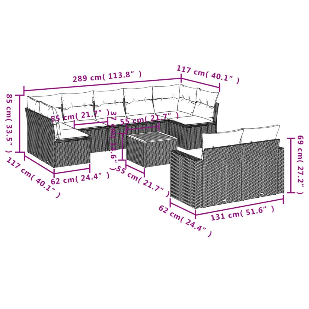 This 10-piece garden sofa set combines style and functionality, making it the perfect outdoor seating solution for any patio or terrace setting. Its modern design and versatile modular structure allow it to fit seamlessly into your existing decor while providing ample space for lounging and socializing, making it ideal for gatherings with family and friends. Modular Flexibility: The modular design of this sofa set means you can rearrange the pieces to create a layout that perfectly suits your space and needs. Whether you want a cozy corner seating area or a long conversational section, this set adapts to your wishes with ease. Durable Construction: Made with UV-resistant poly rattan and a sturdy powder-coated steel frame, this outdoor sofa set is built to withstand various weather conditions. This resilience ensures that you can enjoy this furniture set season after season without the worry of fading or deterioration. Spacious Comfort: With the capacity to seat up to 10 people, this garden set is perfect for entertaining and relaxation. Its generous seating and plush cushions make it an inviting space for outdoor gatherings, barbecues, or quiet evenings under the stars. Easy to Care For: The removable cushion covers are both washable and effortless to maintain, letting you keep the sofa set looking great with minimal effort. This simplicity in care means more time enjoying your outdoor space and less time cleaning. Elegant Aesthetic: The elegant beige tones and modern design of this sofa set create a chic and inviting atmosphere. Its clean lines and woven texture lend a touch of sophistication, making it a beautiful addition to any outdoor area.