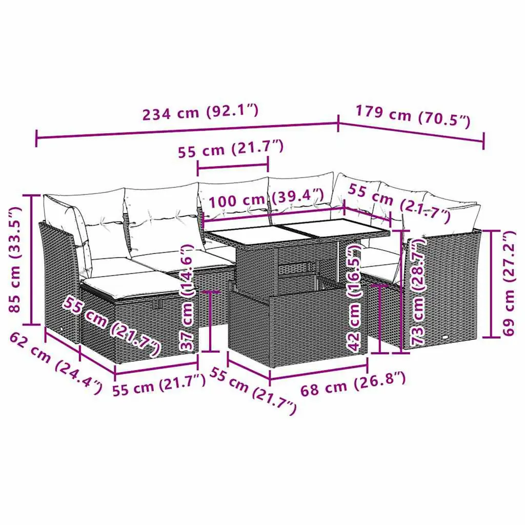 This 8 Piece Garden Sofa Set is the ideal fusion of comfort and style for any indoor or outdoor setup. Its chic woven design works brilliantly for family get-togethers on the patio or cozying up in your sunroom, instantly sprucing up your space and offering plenty of seating for up to seven. Modular Flexibility: Rearrange the seating however you fancy, perfect for a cheery garden party or a classy outdoor dinner. Removable Cushion Covers: Easy to clean, these cushions feature zippers for quick removal, keeping your seating fresh all season. Weather-Resistant Design: Made from UV-resistant materials, this garden set fights fading and damage from the sun, so you can enjoy it all year round. Spacious Footstool: The included footstool with storage gives you extra seating while tucking away your essentials, adding to both use and look. Comfortable Back Support: The well-padded back cushions are made for support whether you're hosting or having a quiet night outside.