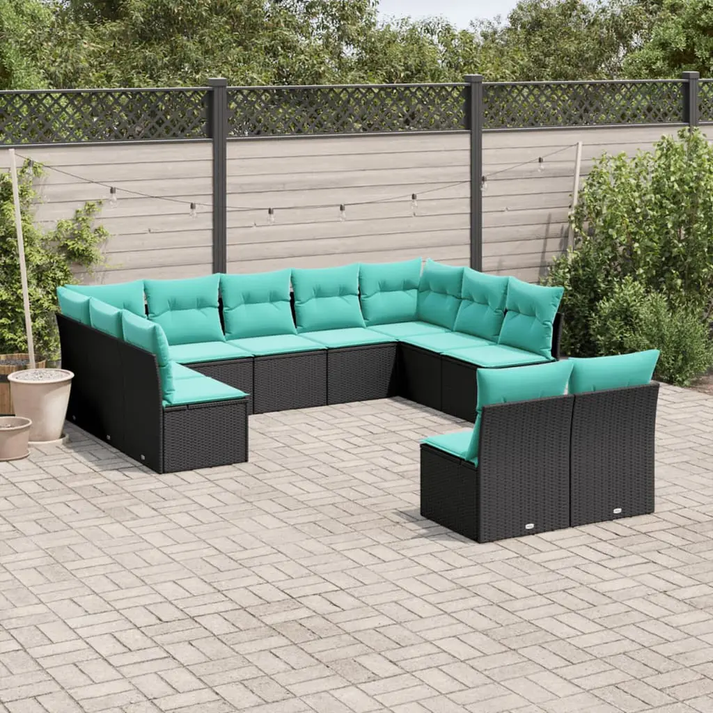 This 11-Piece Modular Outdoor Garden Sofa Set has been designed with flair to offer the ideal blend of comfort and style for your outdoor area. With a sleek black and blue color scheme, this garden sofa set is made from durable PE rattan and powder-coated steel, creating a welcoming space for hanging out or chilling in your garden, terrace, or sunroom. Modular Design: This sofa set allows you to create various configurations to fit your space. You can easily rearrange it to suit your needs.Weather Resistance: Made from UV-resistant materials, this outdoor sofa set can handle sunlight, keeping its bright colors for years.Comfortable Cushions: Each seat comes with plush cushions covered in weather-resistant fabric for long-lasting comfort. The removable covers make cleaning easy.Spacious Seating: This set seats up to 11 people, making it perfect for parties, barbecues, or family get-togethers. Enjoy ample space while entertaining in style.Easy Maintenance: The removable cushion covers and wipe-clean materials make it simple to keep your outdoor furniture looking great.