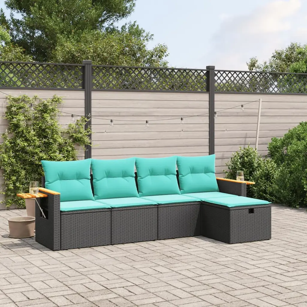 This 5 Piece Garden Sofa Set is a stunning addition crafted to elevate outdoor spaces like gardens, patios, or terraces with its modern and sleek design. The luxurious cushions and soft finish create an inviting atmosphere, perfect for lounging with family and friends or savoring peaceful moments in the sunshine or breezy evenings. Modular Flexibility: The sofa's modular design lets you easily change things up, fitting any gathering from family events to casual hangouts. It keeps everyone comfy and suits various outdoor spaces.Sturdy Construction: Made from powder-coated steel and durable PE rattan, this sofa set is built to last through changing seasons without losing its charm, making it a smart choice for outdoor comfort all year round.Superior Comfort: The plush seat cushions, plus the knife-edged design, offer perfect support, making it easy to chill for hours, whether you're hosting or just kicking back with a good book.Stylish Design: With a contemporary look, this sofa set jazzes up your outdoor decor, combining modern flair with practicality, and enhancing your patio or garden's style.Convenient Storage: Packed with storage options, including in the arm sofas and central pieces, this set provides plenty of room for cushions and outdoor gear, keeping your space tidy and organized.