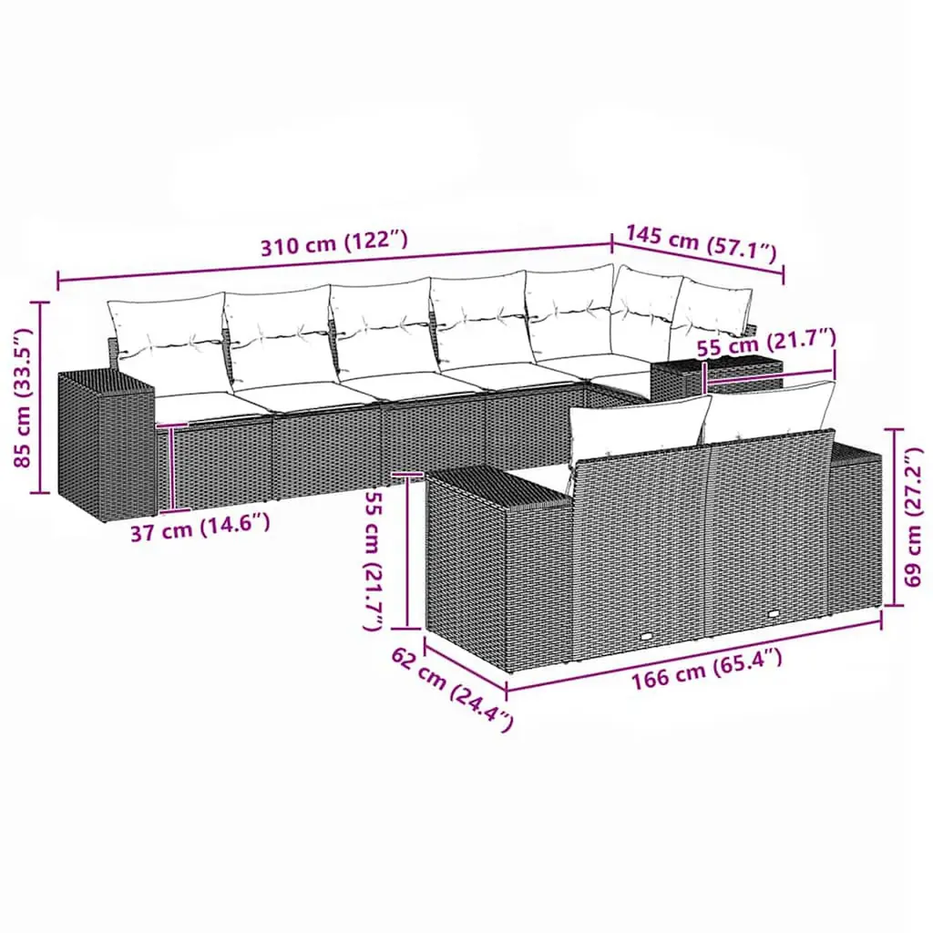 This 8-piece modular garden sofa set brings together style and comfort for some outdoor relaxation. With its sleek modern design made from weather-resistant poly rattan, it offers a stylish yet cozy spot for hangouts on your balcony, patio, or in your garden. The flexible layout lets you easily adjust how you want to set things up, making it fantastic for family and friends while adding a nice vibe to your outdoor space. Modular Design: This sofa set can be easily rearranged to suit your space and preferences. It allows for various setups to fit different occasions, making it a top choice for outdoor use. Weather-Resistant Construction: Made from UV and water-resistant materials, this sofa set can withstand tough weather without fading or degrading. Enjoy the outdoors without worry, knowing your furniture is built to last. Generous Seating Capacity: With spacious dimensions, this set easily accommodates up to 8 people, making it perfect for family gatherings or friendly get-togethers. Removable and Washable Covers: The cushions have removable covers with zippers for easy cleaning. Keep your outdoor sofa looking fresh with minimal effort. Stylish Aesthetic: The modern look and classy black and cream color combo enhance your outdoor decor, adding a snazzy vibe to your garden or patio space.