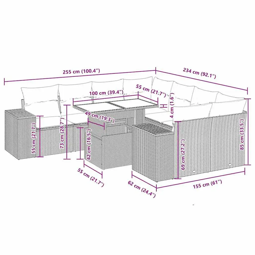 This 9 Piece Garden Sofa Set turns outdoor areas into luxe lounging spots, offering a great place for relaxation, chatting, and outdoor dining. With its modern look and plenty of seating, this sofa set makes patios, balconies, and gardens super inviting for family and friends whenever the weather's nice. Space for Everyone: The set accommodates up to nine individuals, making it great for gatherings and socializing. Each seat is roomy, perfect for hosting friends during summer BBQs or relaxing lazy afternoons. Weather-Resistant Build: Made from high-quality UV-resistant poly rattan, this sofa set is built to handle various outdoor conditions, ensuring it lasts and stays looking good with minimal fuss. Elegant Modern Design: The sleek lines and minimalist style create a standout feature in any outdoor area. Its light and dark color scheme adds a touch of class, blending well with natural surroundings and enhancing modern home exteriors. Easy-Care Features: Each cushion has a removable zipper cover, making cleaning a snap. The covers are waterproof, so they can handle different weather, keeping your furniture looking its best. Multiple Use Cases: Besides lounging, this set is also ideal for dining or serving food during get-togethers. The big surface area of the tempered glass table makes it practical, adding to the versatility of the set for your outdoor spaces.