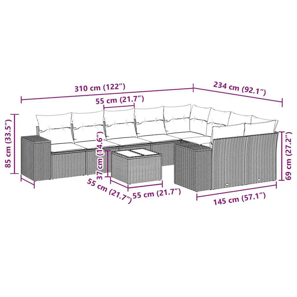 This 10-piece modular garden sofa set blends style with practical versatility, making it perfect for outdoor relaxing or entertaining. Made from durable stuff like UV-resistant poly rattan and powder-coated steel, it’s built to take the weather while giving you a comfy spot to lounge. Ideal for days chilling out in your garden or on the terrace. Modular and Customizable: Each piece in this garden sofa set can be rearranged to fit your space, giving you flexible seating that meets your style and needs.Weatherproof Construction: Made with water-resistant and UV-protected fabric, this sofa set stays strong through all weather, so your outdoor get-togethers can go ahead no matter the forecast.Comfortable Seating for All: With loads of room for up to 9 people, family and friends can hang out together in total comfort, making the most of outdoor living.Inviting Design: The trendy black and cream color scheme adds a modern touch to any outdoor area, making it not just functional but also nice to look at.Simplified Maintenance: The removable and washable cushion covers make cleaning a breeze, keeping your sofa set looking fresh and tidy even after multiple uses.