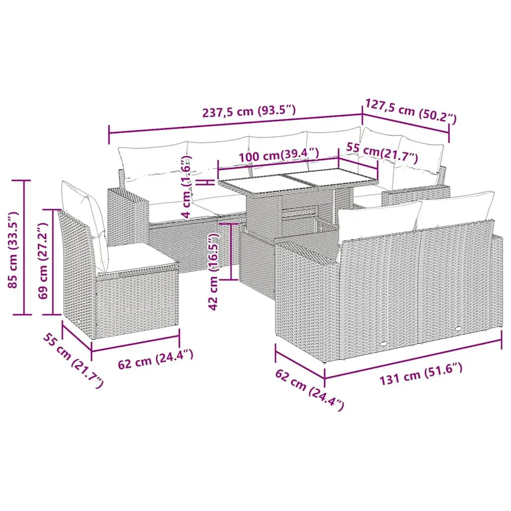 This 9 Piece Garden Sofa Set stands out in any outdoor setting, mixing comfort, style, and functionality. Perfect for patios, gardens, or conservatories, its modern look is nicely complemented by the attractive black and cream colors, seamlessly blending with its environment while providing a lovely space for chilling or hosting. Versatile Modular Structure: The modular design of this sofa set lets you rearrange things to fit your needs and space. Create a cozy corner or a long seating area that fits just right in your garden or patio.Adjustable Armrests: Each armrest can be adjusted, so everyone can kick back in their comfy spot.Outdoor Storage Convenience: With storage in the seats, you can tuck away cushions and other bits easily, keeping your space neat and shielding your stuff from the weather.Durable Materials: Built from high-quality PE rattan and powder-coated steel, this set can take on the elements while still looking good. Weatherproof and UV-protected, it’s a solid choice for outdoor use.Comfortable Cushions: Plush seat and back cushions made of polyester offer awesome comfort. Removable covers with Velcro make cleaning super easy, keeping everything fresh and inviting.