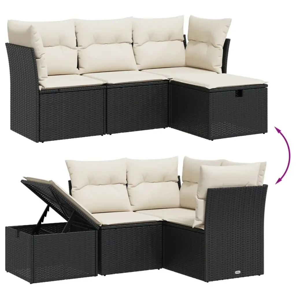 This fantastic 4 Piece Garden Sofa Set combines modern style with comfy seating, making it perfect for your outdoor living space. Constructed from durable poly rattan in a sleek black finish, it fits effortlessly into any balcony, backyard, or terrace, offering a chic and inviting spot for relaxation and socializing. This garden sofa set has a modular design, perfect for arranging however you want in your outdoor area.Made from fade-resistant poly rattan, it looks sleek and stays comfy even in different weather conditions.Thick cushions provide that extra cozy feel, inviting you to relax in style on those warm summer days.With a powder-coated steel frame, it’s sturdy and built to last, providing a solid base for years of enjoyment.Its sleek and modern design with clean lines enhances any outdoor area, cleverly blending style with practicality.