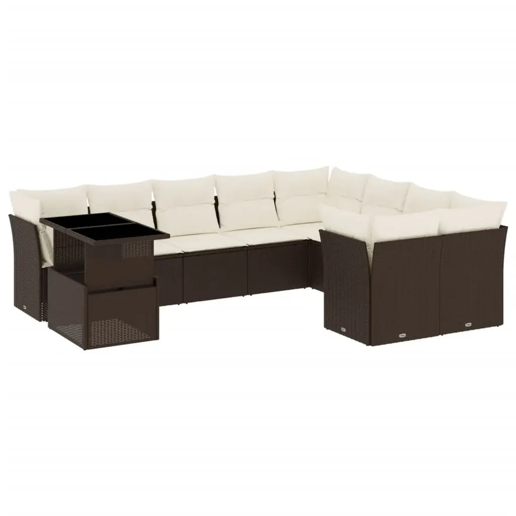 This 9 Piece Garden Sofa Set is a great blend of style and function, designed to make your outdoor living spaces even better. Made from high-quality poly rattan and weather-proof cushions, this setup is perfect for chilling out or entertaining on your balcony, terrace, or patio. Modular Design: Rearrange the sofa set to fit your needs. Easily change your outdoor setup to suit gatherings, whether small or large.Durable Construction: Made from UV-resistant materials, this garden sofa set can handle the weather, ensuring it lasts for years without much hassle.Supreme Comfort: The soft cushions make it a great spot to relax, chat, or entertain on sunny days.Textured Aesthetic: The modern finish looks great in any garden, adding a stylish touch to your outdoor decor.Easy Care: The cushion covers can go in the washing machine, so keeping it fresh and tidy is no hassle.