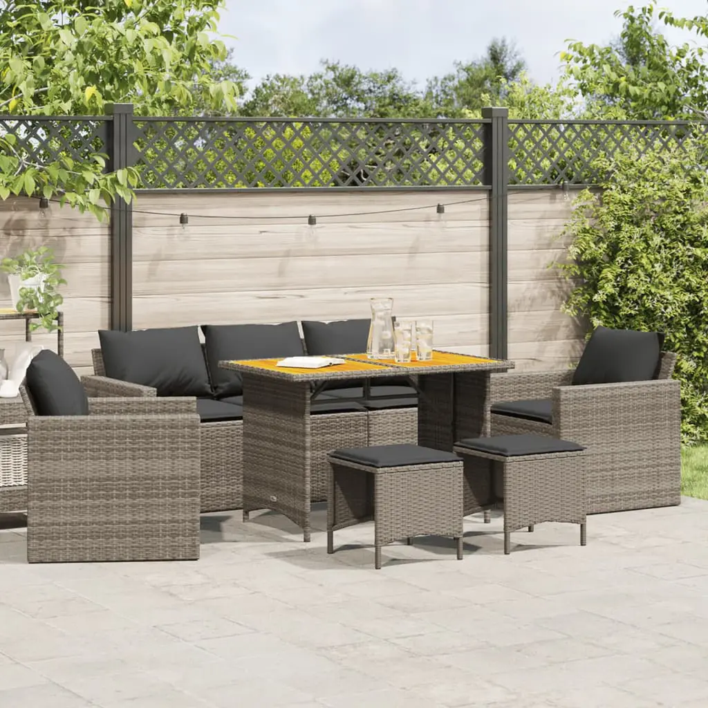 This 6-piece garden sofa set brings modern style together with practicality for a fantastic outdoor experience. It includes a spacious three-seater sofa, two arm sofas, two garden stools, and a garden table, all in a trendy grey that fits with any outdoor décor. Modular Design: The sofa set features a modular design that lets you arrange it however you want, whether it's a snug spot for two or a sprawling setup for entertaining friends, its flexibility is a major win. Weather-Resistant Materials: Made from UV-resistant PE rattan and powder-coated steel, this set is built to handle the elements while keeping its good looks. Enjoy your outdoor time without stressing about fading or weather damage. Comfortable Cushioning: Every piece comes with thick, comfy cushions that have removable, washable polyester covers, giving you a plush place to kick back. The cushions are weather-resistant, so they’ll stay in great shape for ages. Chic Finish: The solid acacia wood table is oiled, which not only enhances its appearance but also protects it from moisture and marks, adding a classy touch while ensuring it lasts long. Perfect for Various Settings: Great for balconies, patios, or gardens, this set provides a smart spot for chilling or hosting. The stools add extra seats while enhancing the outdoor vibe.