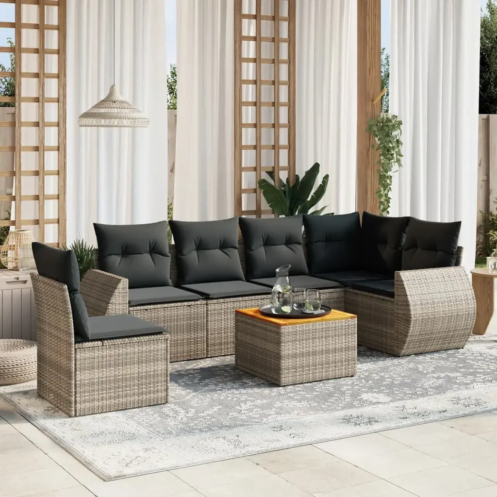 This 7 Piece Garden Sofa Set with Cushions is a great mix of style and comfy seating for your outdoor chill time. Made from tough materials like poly rattan and solid acacia wood, this set adds some modern vibes to your garden, terrace, or patio, ensuring your gatherings are memorable and laid-back. Flexible Configuration: Modular design lets you switch it up to suit your space, whether it’s a cozy balcony or a large patio.Comfortable Seating: Each piece has plush cushions covered in weather-resistant fabric for comfy prolonged sitting.Durable Build: Made with UV-resistant materials and a powder-coated steel frame, this set is made to handle the weather and last a long time.Stylish Appearance: The sleek grey look goes well with various outdoor styles while adding a fresh vibe to your space.Easy Maintenance: The cushion covers come off easily with zippers for quick cleaning, keeping your set looking smart and vibrant.