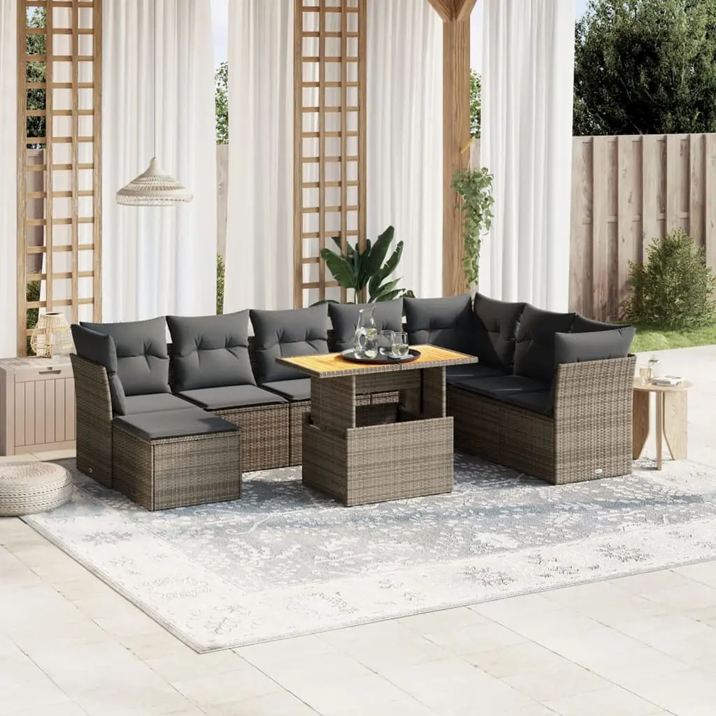 This Modern Grey Garden Sofa Set with Cushions turns any outdoor area into a stylish and inviting spot for chilling and entertaining. With a focus on modern looks, it features a sleek design, polished materials, and cushions that offer both support and style, making it a great addition to any patio or garden. The deep grey of the poly rattan paired with a textured finish creates a look that blends beautifully with nature, ensuring a lovely setting for family gatherings or quiet evenings. Adjustable Armrests: Get comfy with armrests that you can move to your desired height. Great for lounging, adds a personal touch to your seating. Durable Construction: Made from powder-coated steel and PE rattan, this set stands up to UV rays and moisture, keeping it strong and reliable in your outdoor space. Spacious Design: This sofa set is roomy enough for up to 9 adults, which is perfect for hosting friends or family time outdoors. Easy Maintenance: Each cushion has a removable cover zipped up for hassle-free cleaning, making sure your seating always looks sharp. Diverse Arrangement: Thanks to its modular format, you can arrange this sofa set in heaps of ways to fit your backyard or balcony, creating the ultimate outdoor lounging experience for any occasion.