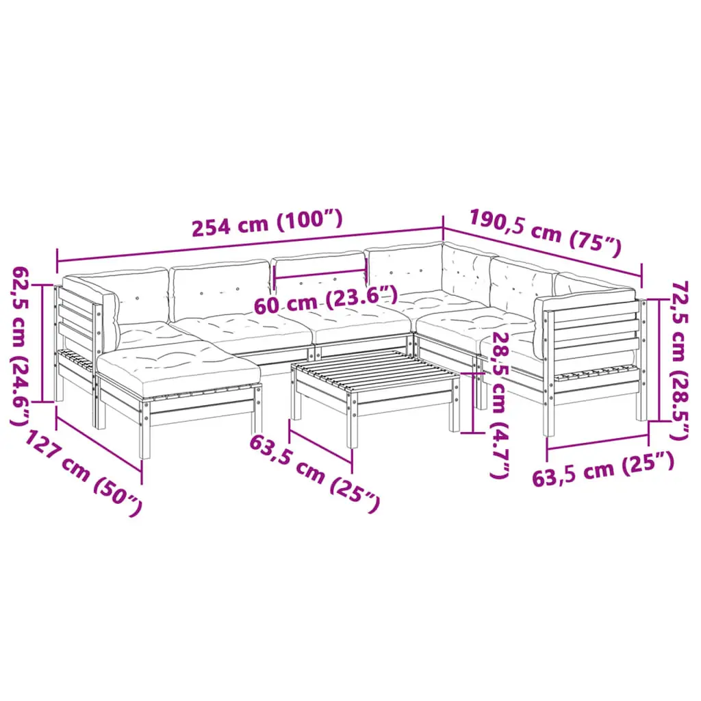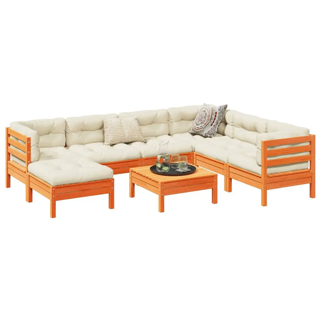 This 8-piece garden sofa set is a stunning outdoor furniture collection perfect for transforming any balcony, terrace, or patio into a comfy spot for catching up with family and friends. Finished in a warm wax brown, its rustic vibe and solid pine wood build give it a hearty yet appealing look, great for outdoor dining or lounging in the sun. Versatile Seating: The modular design lets you change the arrangement to fit different outdoor spaces, perfect for all occasions.Robust Construction: Solid pine wood ensures durability against the elements and increases your furniture’s lifespan.Comfortable Cushions: Each piece has soft, removable cushions in breathable Oxford fabric for lounging in style.Easy Maintenance: The zippers on the cushions make cleaning easy, keeping your sofa looking fresh season after season.Generous Dimensions: With spacious 24.8 in x 24.8 in seats, this sofa set can accommodate 8 people comfortably, great for both small and large gatherings.