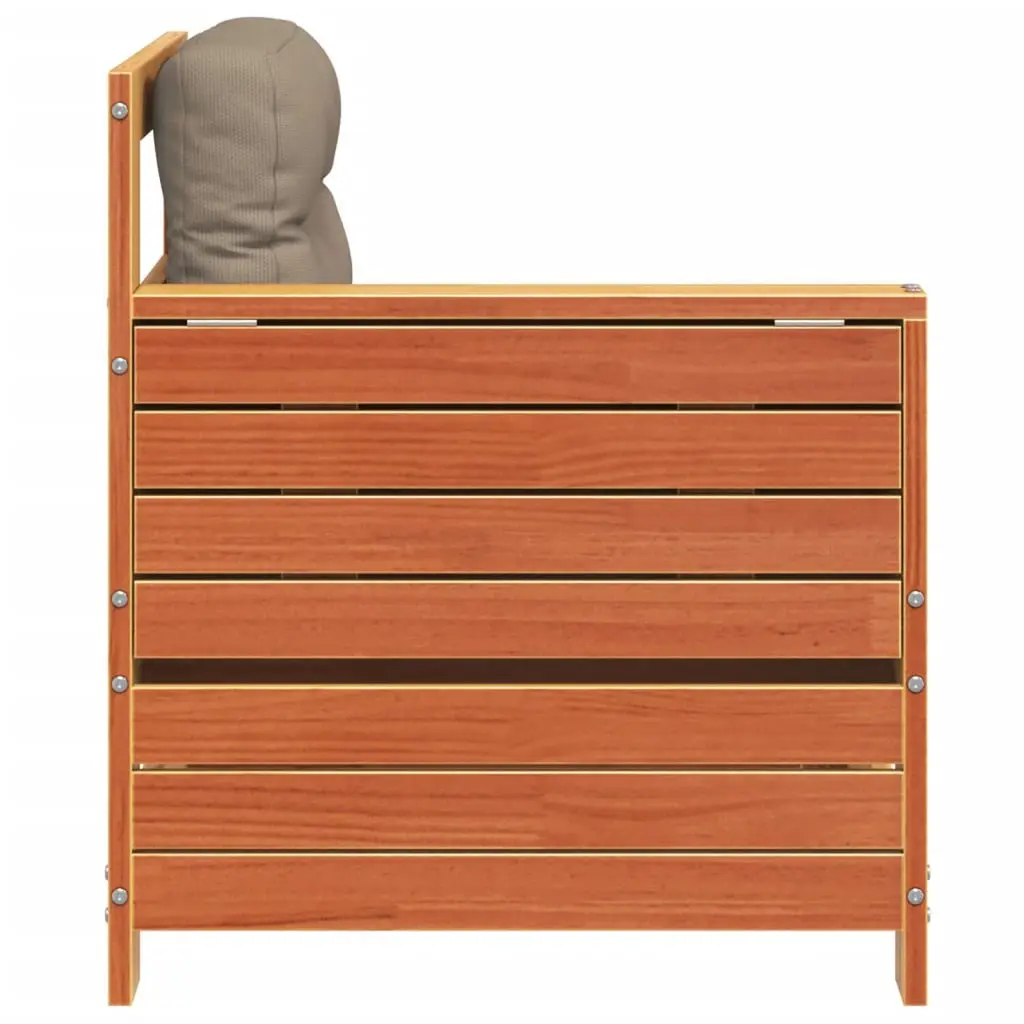 This Garden Armrest Sofa combines practical design with rustic charm, making it an ideal addition to outdoor spaces like balconies and terraces. Made from robust solid pine wood, its wax brown finish not only shows off the natural beauty of the material but also creates a warm, inviting atmosphere perfect for lounging or having a chat. Natural Beauty: The untreated solid pine wood surface has a smooth feel and shows off the wood grain, giving a nice organic look that fits well in gardens.Comfortable Cushions: The sofa comes with two soft cushions made of durable polyester fiberfill for comfy seating, plus zippers for easy cleaning.Foldable Convenience: Designed for simple storage, the sofa can flatten down for easy transport and stashing away when you’re not using it.Perfect for Socializing: This seat arrangement is just right for relaxed chats with family or friends, making it a sweet spot for enjoying the fresh air and lovely surroundings.Adjustable Features: The flexible design lets you change things up with different modules, adding versatility to your outdoor space.
