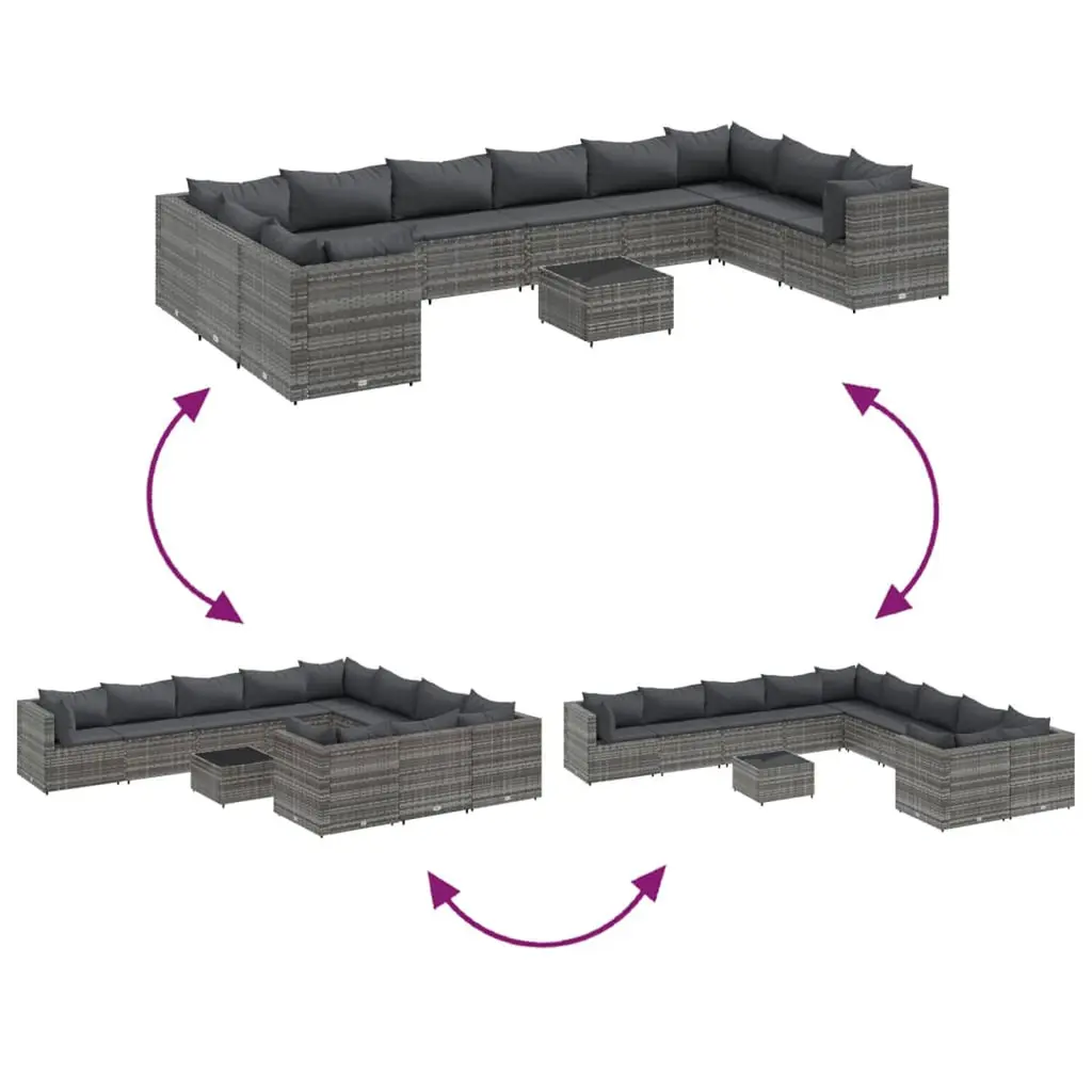 This 11-piece garden sofa set is a stylish mix of comfort and flair, perfect for your outdoor lounging. With a sleek grey poly rattan finish, it sets a chic vibe that's just right for socializing or a quiet evening under the stars. Modular Design: The modular set-up lets you personalize the corner and center seat arrangements, so you're ready for anything, whether throwing a barbecue or a cozy night in.Durable Materials: Made from UV-resistant materials, this set holds up to sun exposure, staying looking fab and functional no matter the weather.Ample Seating Capacity: With room for 10, this sofa set fits perfectly in larger outdoor areas, letting you host family and friends comfortably.Easy Maintenance: The cushions come with zippers to easily remove and clean them when spills or stains happen.Stylish and Modern: Its chic, sleek design and grey tones work beautifully with modern outdoor décor, giving you both style and good usability.