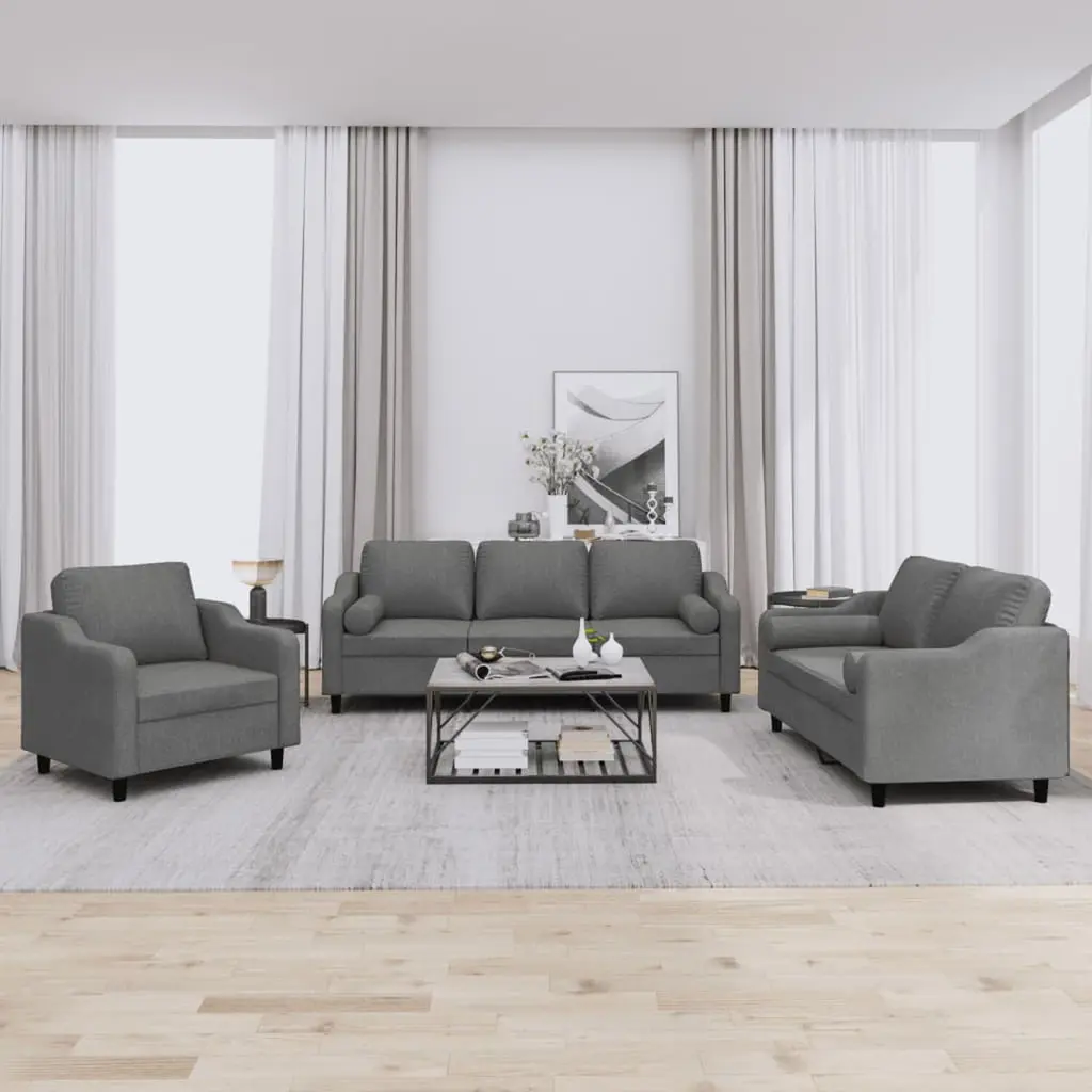 This plush 3-piece sofa set, clad in dark grey polyester fabric, nails the perfect mix of modern looks and comfy vibes, making it a fab centerpiece for any living room. Its roomy design and classy finish amp up the feel of any hangout area, delivering both function and style that suits all sorts of decor tastes. Breathable Material: Made with breathable polyester, this sofa set keeps things comfy, allowing air to flow even when you're lounging for ages. Perfect for chilling out with a book or entertaining guests. Generous Seating Capacity: Seats up to seven people, making it perfect for family gatherings or movie nights. No one gets left out while having fun together. Contemporary Style: Modern design with clean lines and a matte finish matches various decor, from chic minimalist to cozy traditional vibes. It makes your living room look inviting and stylish. Easy Maintenance: The cushions have removable covers with zippers for easy cleaning, keeping the sofa looking fresh without any hassle. Quick response to spills ensures it stays inviting over time. Versatile Use: Designed for indoor spaces, this sofa set is all about enhancing relaxation. Perfect for reading, family fun, or just kicking back, it fits right into your lifestyle with ease.