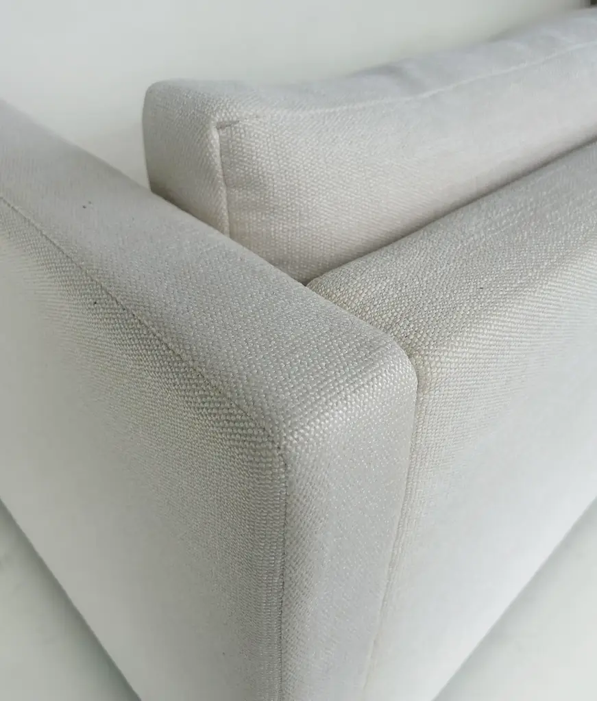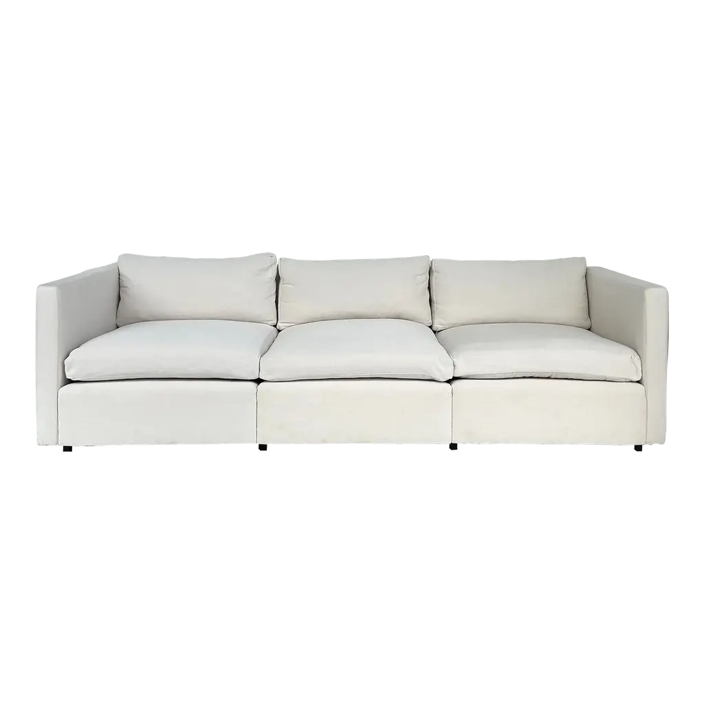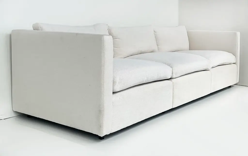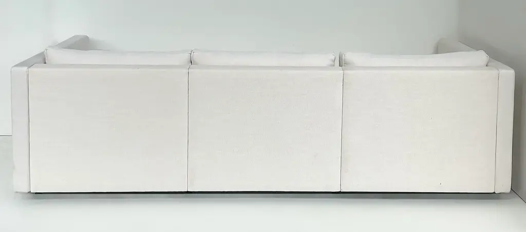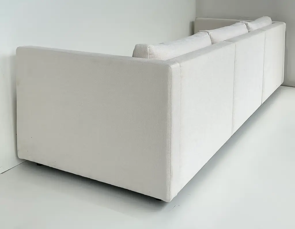 Vintage Charles Pfister Knoll Studio Upholstered Sofas, Two Available Offered for sale individually are two upholstered three-seat sofas designed by Charles Pfister for Knoll Studio. These sofas were recently reupholstered in a Knoll linen-blend tweed fabric. The sofas have three loose seat and back cushions and are incredibly well-made and comfortable. They are priced individually and two are available. As the sofas have been reupholstered they no longer retain the Knoll labels. They are guaranteed to be original. Dimensions: Height: 26 in (66.04 cm) Width: 87.5 in (222.25 cm) Depth: 33 in (83.82 cm) Seat Height: 16 in (40.64 cm)