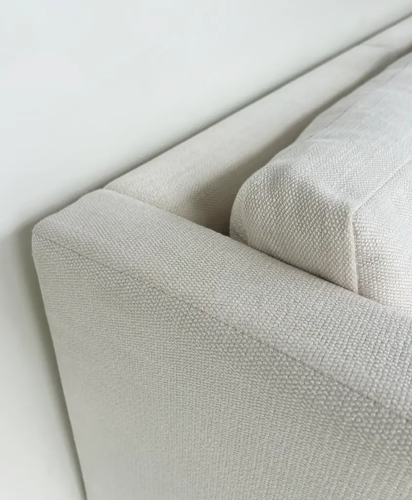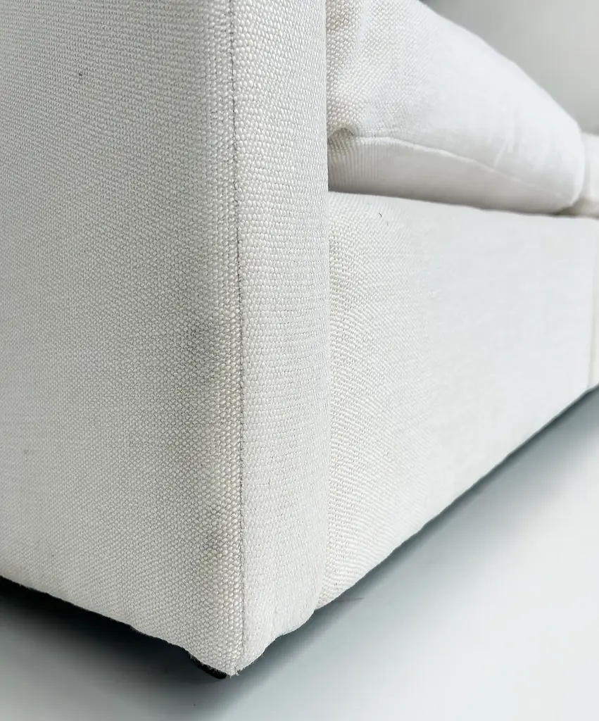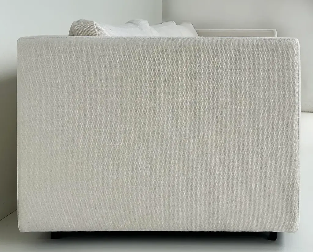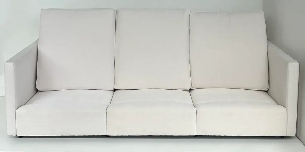 Vintage Charles Pfister Knoll Studio Upholstered Sofas, Two Available Offered for sale individually are two upholstered three-seat sofas designed by Charles Pfister for Knoll Studio. These sofas were recently reupholstered in a Knoll linen-blend tweed fabric. The sofas have three loose seat and back cushions and are incredibly well-made and comfortable. They are priced individually and two are available. As the sofas have been reupholstered they no longer retain the Knoll labels. They are guaranteed to be original. Dimensions: Height: 26 in (66.04 cm) Width: 87.5 in (222.25 cm) Depth: 33 in (83.82 cm) Seat Height: 16 in (40.64 cm)