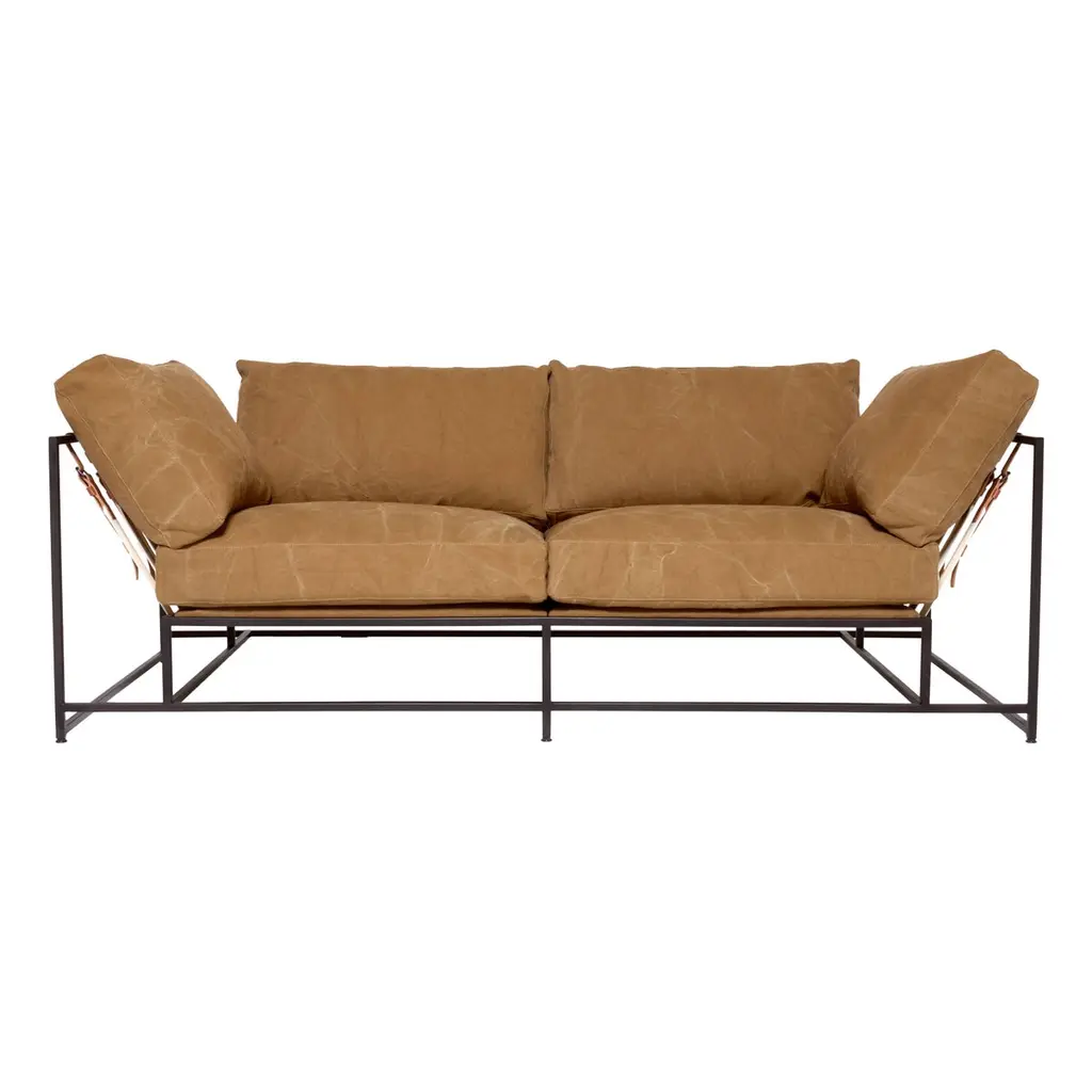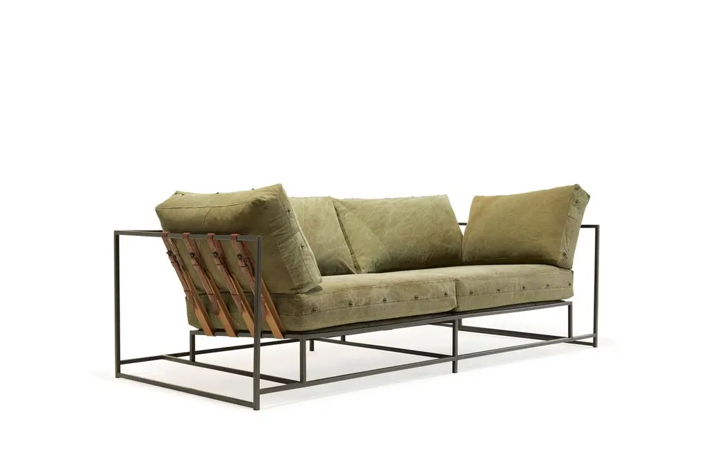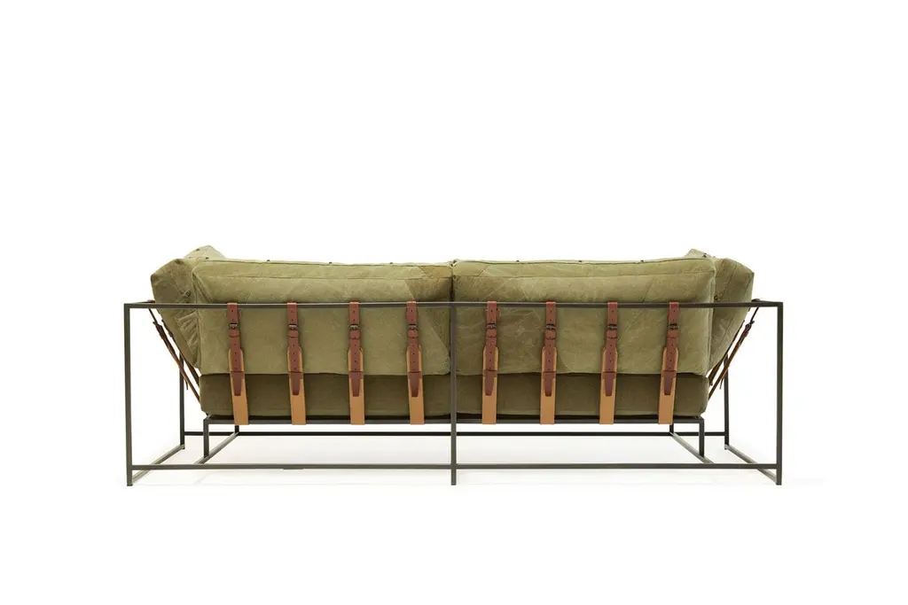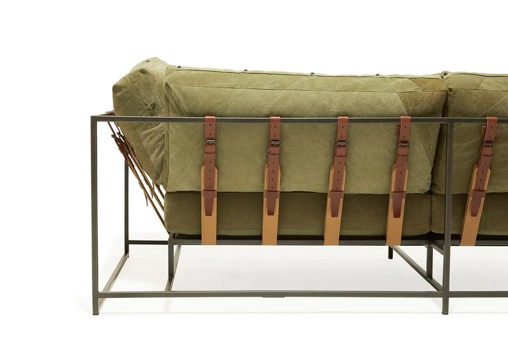 Slightly smaller in size, the two-seat sofa is ideal for apartments or smaller spaces requiring a smaller footprint.Since first designing Inheritance collection, Stephen Kenn has been inspired by the inherent history in vintage military-issue materials. Each piece of vintage olive green military canvas is distinctive and will have unique markings from its long history of use. The foam seat cushions have been wrapped in polyfiber, allowing for a soft and comfortable lounge experience. Sitting atop a blackened steel frame, the piece has support belts featuring taupe cotton webbing, oxblood leather, and blackened steel buckles.Our military canvas is a vintage material, and as such has some small imperfections, stamps, lettering, or markings from the soldiers who used them. We celebrate these imperfections and do not consider them to be eligible for warranty claims. There is also shade variation in olives and greens. Exact color matches are not possible.Every Stephen Kenn piece is made to order through our Los Angeles studio. We create these pieces utilizing a number of small businesses and fabricators in the LA area.