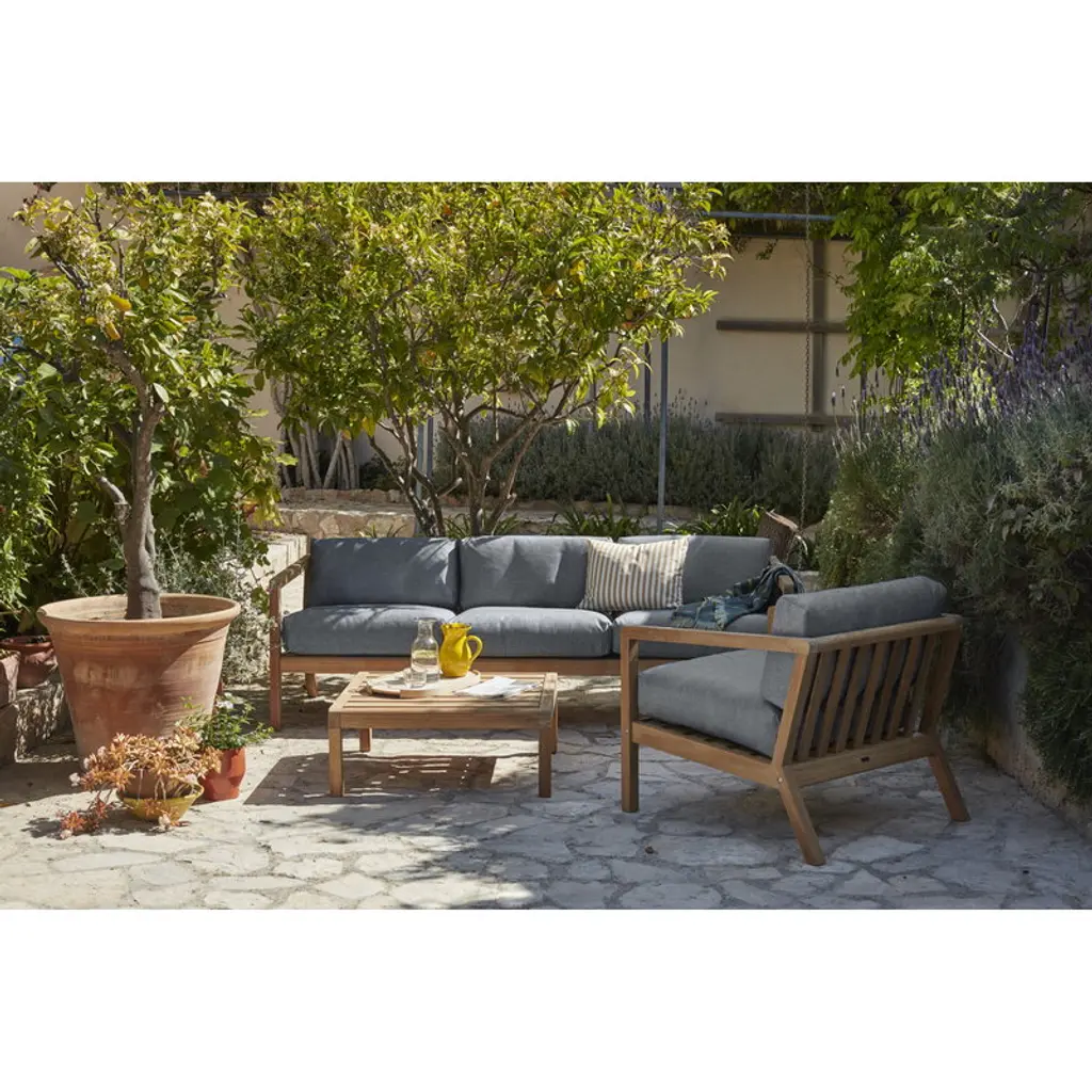 Skagerak’s Virkelyst sofa is so comfortable that you could easily think it’s designed for indoor use. However, the three-seater sofa, consisting of a minimalist teak frame and plush cushions, is specially designed for outdoors and its upholstery is therefore very durable as well as water and dirt resistant. The hypoallergenic Fossflakes inside the cushions are known as a very breathable padding material that maintains its shape over time. . Virkelyst is a modern outdoor furniture range, designed by SAYS WHO for Skagerak, combining a clean-lined design with the natural appeal of teak wood which, in time, will develop a beautiful silvery gray patina. Combine your favorite Virkelyst furniture to get a stylish sofa set for your garden or porch or create a small summer oasis on the balcony.