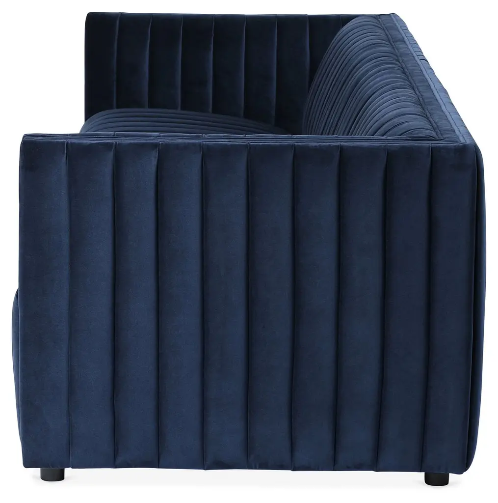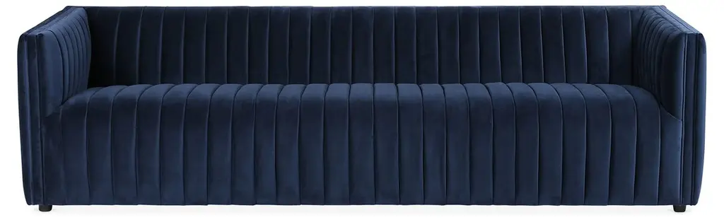 Boasting a clean-lined design, this low-profile sofa encourages luxurious lounging with its channel-tufted frame and plush cotton-blend velvet upholstery. Ample padding ensures long-lasting comfort and support.